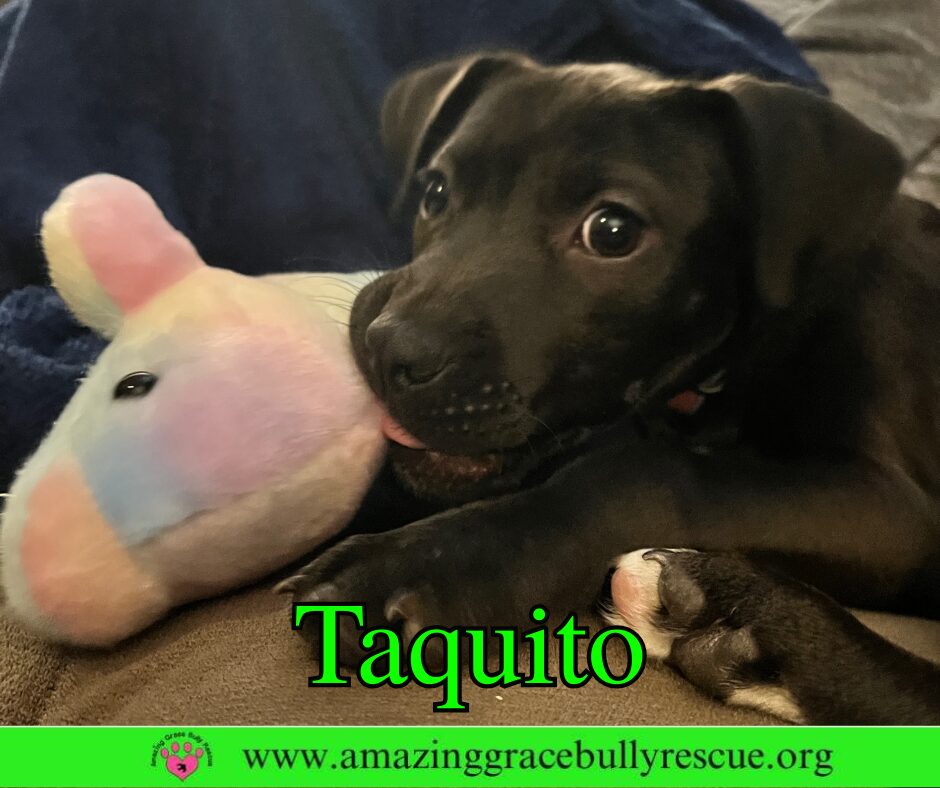 See Taquito (aka Xena)’s HomepageGo to our official websiteYou can fill out an adoption application online on our official website. Meet Taquito — a small but mighty adoptable puppy (born 7/30/25) who is ready for her forever home! Taquito may be tiny right now, but she has a big, lovable personality and is expected to grow into a medium/large dog around 50 lbs. Taquito is thriving in her foster home, learning from her dog siblings, and proving every day that she can keep up with larger dogs. She loves darting through the dog door to join in the fun and play with the “big dogs.” This sweet girl is wonderful with young children (ages 1–5) and recently met a cat, showing no real interest. She is making excellent progress with potty training, working on her recall, and showing how eager she is to learn and please. When she’s done playing, Taquito becomes a total cuddle bug who wants nothing more than to be near her people. She would make an amazing companion for families looking for a friendly, social, and affectionate growing pup. If you’re searching for a puppy with a big heart and tons of potential, Taquito might be your perfect match. Apply to adopt Taquito today and give this sweet little warrior the loving home she deserves! Amazing Grace Bully Rescue is a foster-based rescue in Pensacola, Florida. We do not have a physical building. If you want to meet any of our pups, the first step is to complete our online application, and someone from the Rescue will contact you. Taquito is current on her puppy shots, dewormed, will be spayed, and will have a registered microchip. If you would like to adopt this Amazing dog or set up a meet and greet, please fill out our online adoption application at www.amazinggracebullyrescue.org If you have any questions, please text your question to 850-723-2037. You may also send a message to our Amazing Grace Bully Rescue Page on Facebook, Twitter, Instagram, or send an email directly to amazinggracebullyrescue@gmail.com Disclaimer: We are located in Pensacola, Florida, and will consider local applicants first, especially for the puppies, as we utilize a local veterinarian.