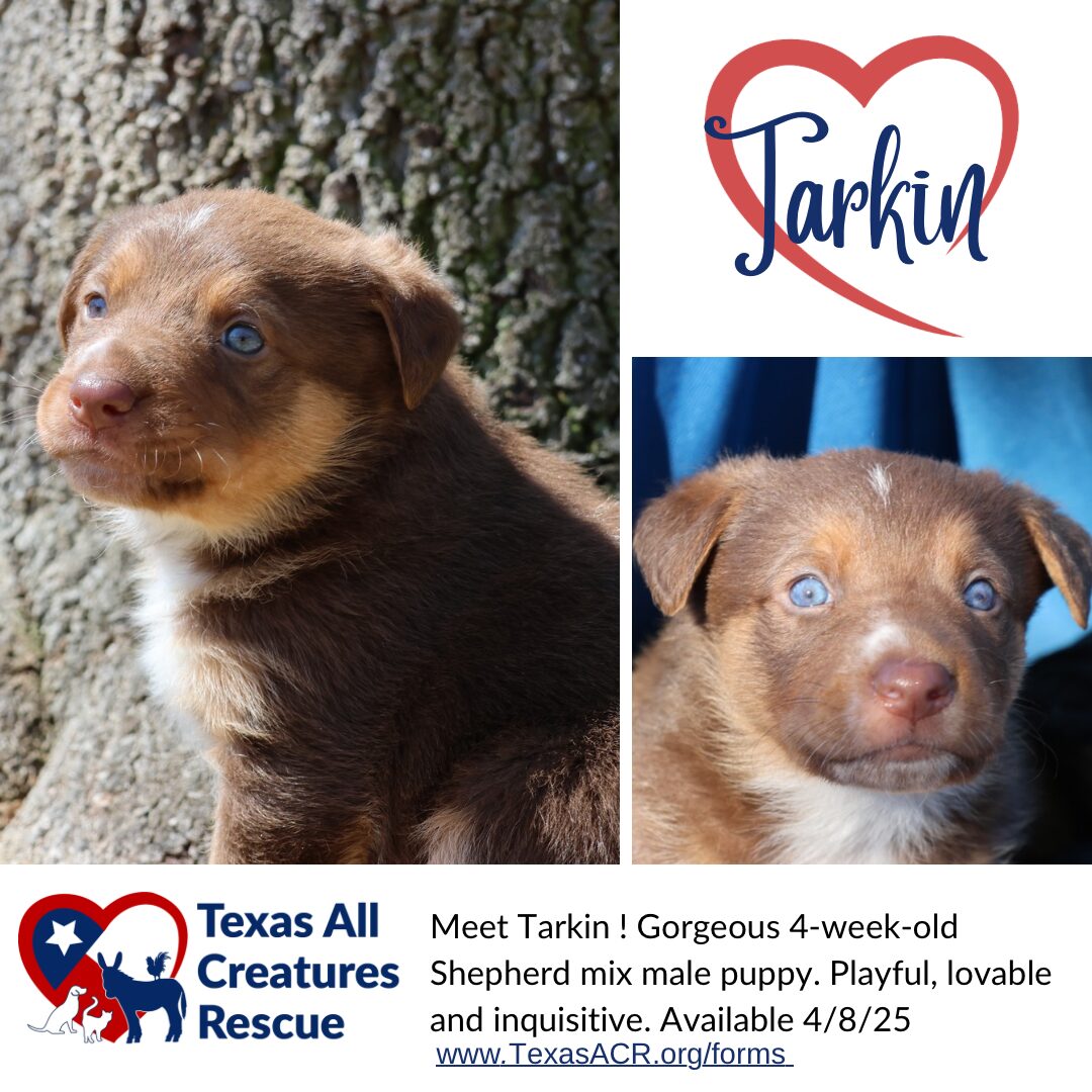 See Tarkin’s HomepageGo to our official website Ready for Pre-Adoption! Meet Tarkin – a 4-week-old bundle of confidence and curiosity! This orange-collar boy is social , bold , and always eager to explore. Whether he’s snuggling up for a cuddle or investigating something new , Tarkin’s playful personality and loving nature make him an irresistible companion. If you’re looking for a curious, confident snuggle buddy , Tarkin might be the perfect match for you! He will be ready to join his new family on April 8, 2025 . Apply today and make Tarkin part of your family! TexasACR.org We are a non-profit 501c3 Animal Rescue located in Dallas/Fort Worth, Texas. Our passion is centered around assisting animals that have been abandoned, neglected, or abused. We are a foster-based rescue consisting of 100% volunteers. If you are interested in becoming a foster, please email info@TexasACR.org