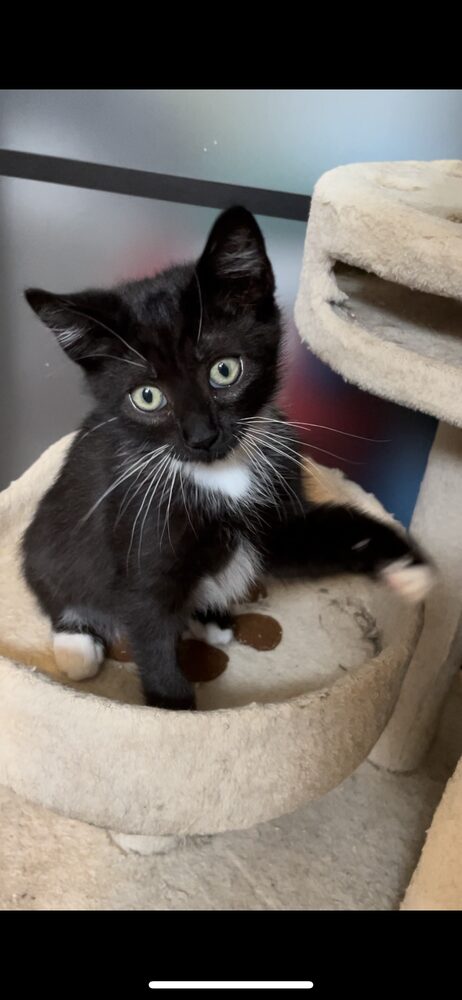 Meet T'Challa, our sleek and striking black panther kitten, with the cutest little toes dipped in cream. He may be the runt of the litter but he's got the biggest heart and enjoys playing with people the most. While he loves romping with his littermates, as soon as he sees a human, he runs over to purr and play. It's like he knows only people can make the dangly toys wiggle for him. He's super alert and watches you carefully, you can see how smart he is in his bright green eyes.He's equally happy sleeping in a pile with his littermates or in your lap, as long as he's warm and snuggly. T'Challa purrs nonstop and has the sweetest little meow. He's a very vocal little boy.For more photos and videos please see our website www.hdbnqrescue.org/queens Youtube: www.youtube.com/@hdbnqrescue
