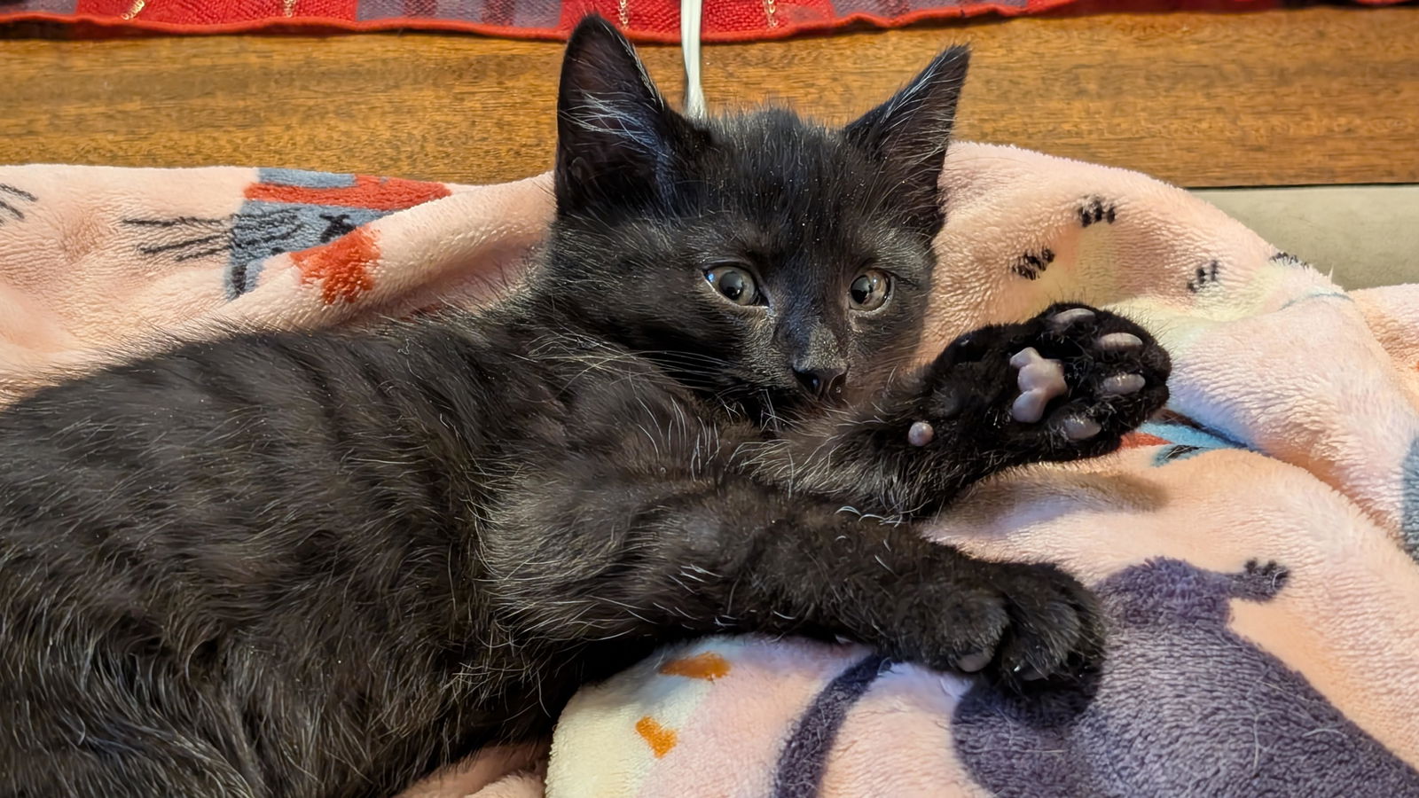 Please meet this cutie – Teddy Bear ! He’s 8 weeks old as of 01/05/2026, a medium-haired, black ‘ghost’ tabby that is full of energy! He will play with anything, loves ribbons & strings, and carries his favorite toy around everywhere:). Please see the photo of Teddy Bear with what used to be a wand toy with feathers. He’s great with other kittens and cats. He loves to cuddle & purr on your lap when he finally tires himself out after playing. Teddy Bear is litter box trained & fully vaccinated. Please submit our no-obligation Adoption Application for a meet and greet or to adopt: https://forgottencats.org/adoption-application/. Thank you! (Foster: Amy P.)