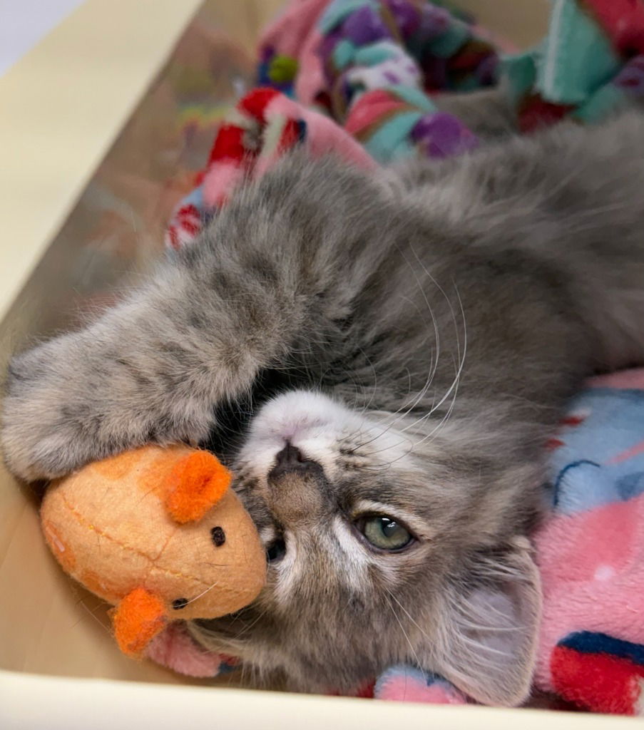 Meet Thistle — a teeny, fluffy grey kitten who looks like she was made entirely of soft intentions and gentle squeaks.Thistle is petite and precious, with a round little face, cloud-soft fur, and a sweet, tiny meow that sounds more like a question than a sound. She uses it often—just to check in, to ask for affection, or to announce that she has arrived (very bravely) in the room. It is impossible not to melt when she does.She’s affectionate in the most heart-stealing way: slow blinks, careful snuggles, and curling up against you like she fits there perfectly—which, somehow, she does. Thistle loves being held, being near, and being adored, and she accepts praise as if it is both deserved and expected. Playtime comes in short, enthusiastic bursts, followed immediately by naps that make her look even smaller than she already is.Soft, sweet, and overwhelmingly cute, Thistle feels like a kitten you can’t believe is real—one tiny meow at a time. *Kittens under 16 weeks of age must be homed with another cat or adopted in pairs for their social developmentAdoption fee includes:✅ Spay/Neuter✅ Vaccines✅ Microchip✅ Treated for fleas and worms Interested in meeting Thistle?Email us at: adoption@columbiahumane.org to request an application.Adoption Fee: $175For more information call 503-397-4353 or email adoption@columbiahumane.org