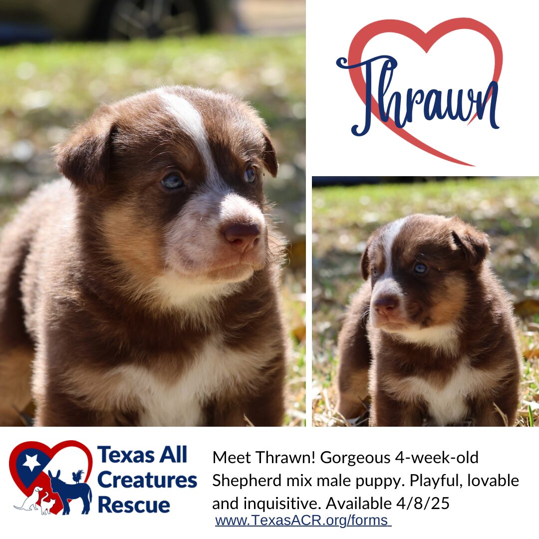 See Thrawn’s HomepageGo to our official website Ready for Pre-Adoption! Meet Thrawn – a 4-week-old sweetheart who loves being close to his people! This gray-collar boy seeks out companionship and is always ready to shower you with kisses . He’s social , playful , and sure to bring joy to any home with his affectionate personality. If you’re looking for a loving, playful companion , Thrawn might be the perfect match for you! He will be ready to join his new family on April 8, 2025 . Apply today and make Thrawn part of your family! TexasACR.org We are a non-profit 501c3 Animal Rescue located in Dallas/Fort Worth, Texas. Our passion is centered around assisting animals that have been abandoned, neglected, or abused. We are a foster-based rescue consisting of 100% volunteers. If you are interested in becoming a foster, please email info@TexasACR.org