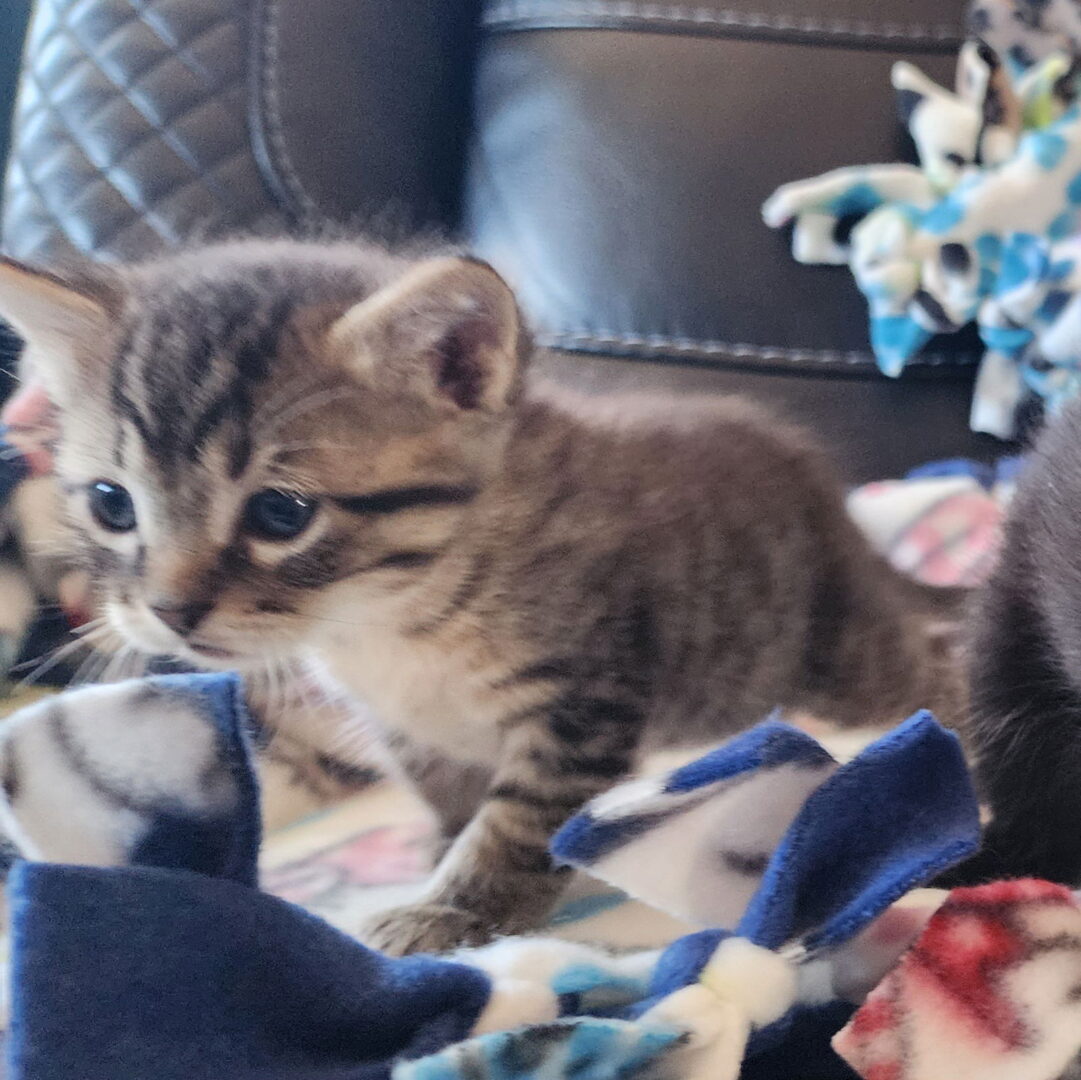 See Thunderee’s HomepageGo to our official websiteYou can fill out an adoption application online on our official website. *This animal is located at our same-day adoption center partner, St. Louis Park PetSmart. Please contact this location prior to visiting to ensure this animal is still available. A paper adoption application will be completed on site so please do not submit an online adoption application. For more information on adopting from one of our adoption center partners, please visit our Adoption Center Animals page. Thunderee: The little cloud of calm. He is the smallest of his litter and the definition of an independent spirit. He is a quiet, thoughtful kitten who loves to play but is happiest when he finds a secure, soft place to snuggle up for a nap. He's independent but loves a good cozy cuddle session when the day is done. Thunderee is a smart kitten who is currently learning proper litter box etiquette. He is watching his siblings closely and will need an adopter who can patiently continue his training. Thunderee is from a stray surrender with Mama and 8 siblings. To learn more about Ruff Start’s adoption process and the care our foster animals receive, please visit our How to Adopt page. If you are unable to adopt but want to help this animal and others in our care, you can donate to support the medical and veterinary needs of all Ruff Start Rescue animals. Want to adopt a kitten? We highly recommend you consider bringing home two instead of one! Adopting kittens in pairs has been proven to be beneficial for cats’ emotional and behavioral well-being and greatly improves the likelihood of long-term adopter happiness as a result. Adopting more than one kitten also reduces the risk of “Single Kitten Syndrome” (also known as Tarzan Syndrome), a symptom of under-socialization during a kitten’s most formative weeks. Kittens who are under-socialized may develop aggressive tendencies toward both other animals and humans as they grow, creating lifelong behavioral issues for owners.