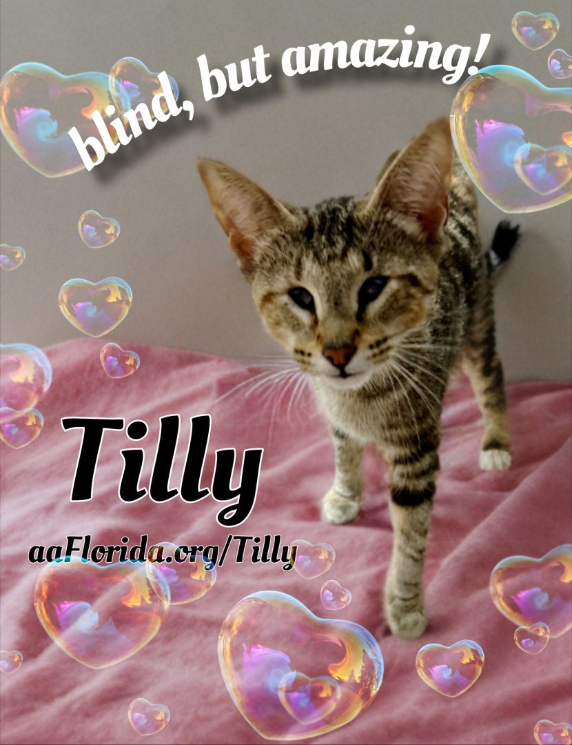 See Tilly ~ an amazing blind kitty’s HomepageGo to our official websitePlease contact Teri (tlz4700@cox.net) for more information about this pet.Please consider sponsoring a cat. For a little as $10 a month you can help us help more animals in need.Blind kitties are amazing! They can climb cat trees and play around the house just fine. The only "special" thing she needs is to live in house where the furniture doesn't get moved around a lot. Blind cats remember the layout of the house & that allows them to get around easily. Tilly is a sweet, marbled tabby girl who sees with her heart. Imagine this baby wandering around OUTSIDE alone! Fortunately, she was found by one of our volunteers. Our vet thinks she was likely born without eyes. She is friendly, but cautious – understandably. Tilly LOVES to play! She will chase balls and bring them back to you. After breakfast is her favorite playtime. We think Tilly will thrive in a home with a couple or no other pets. Our adoption fees are $75.00 for any kitty 6 months of age or older. $85 for kittens under 6 months of age. Included in each adoption: age appropriate shots, microchip, and spay/neuter surgery. All kitties are litterbox trained. Prior to meeting or adopting any of our wonderful kitties, we ask that you please fill out our online Cat Adoption Application on our website aaFlorida.org/adopt. There is a link on the top of the home page. Click on "Fill in", you don't have to register. For more information about this kitty or any others, you can contact us at Adoptions@aaFlorida.org. We are a foster organization and don't have set hours we are open – but we will gladly set up an appointment for you to meet any cat. Of course, you're under no obligation to adopt if you come to meet any of our fabulous felines.