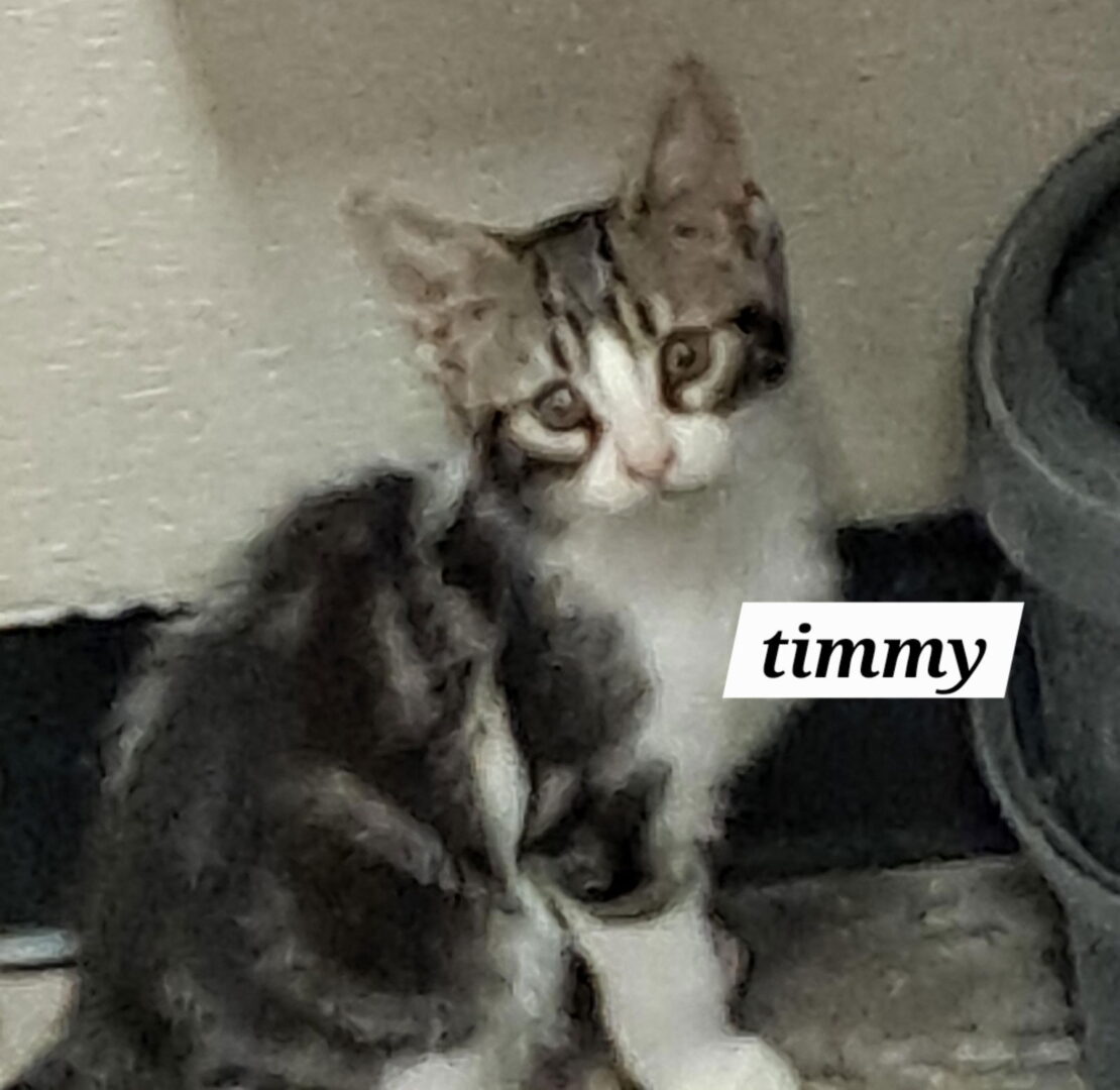 Timmy is a marbled black and white tabby. He says, ‘I am a playful and lovable little guy. I am quick to purr when I am picked up. I like to play, especially with any toy that has feathers.’ Ivy, Annie Oakley (adopted), Duke and Timmy are 9 weeks old as of June 12 and are playing in our Brandywine PetSmart adoption center. Please stop by for some playtime! Please submit our no-obligation Adoption Application: https://forgottencats.org/adoption-application/. Thank you! (Foster: Kim K.)
