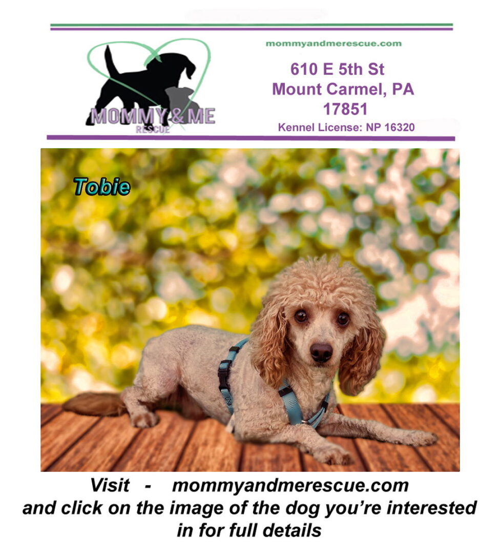 See Tobie’s HomepageGo to our official websiteYou can fill out an adoption application online on our official website.All adopters are required to meet at our rescue center in Mt Carmel, PA (no exceptions). Please EMAIL all questions to rescue.me.pa@gmail.com Please fill out an application here > https://mommyandmerescue.com/adoption-application/ and give your vet clinic permission to speak with us. Spayed/Neutered, UTD on vaccines, Chipped Adoption fee 400.00 You must submit the application and be approved prior to meeting one of our dogs. If you have questions please EMAIL rescue.me.pa@gmail.com or visit mommyandmerescue.com Kennel License: NP 16320 Tobie Male Mini Poodle Age: 7-26-21 Weight: 12 pounds Tobie was rescued from a breeder situation. He is a very sweet dog, but very shy. Tobie doesn’t know much about the real world but he is learning. He now will walk on a leash and enjoys spending time outside. He likes being held and petted. Tobie likes other dogs and older kids. Tobie goes potty when we take him out but I wouldn’t consider him fully house-trained yet. License: NP 16320 PLEASE NOTE- we do not refund deposits if you change your mind. We are a PA licensed, 501C3 non-profit rescue. Visit our page for more information http://www.mommyandmerescue.com/