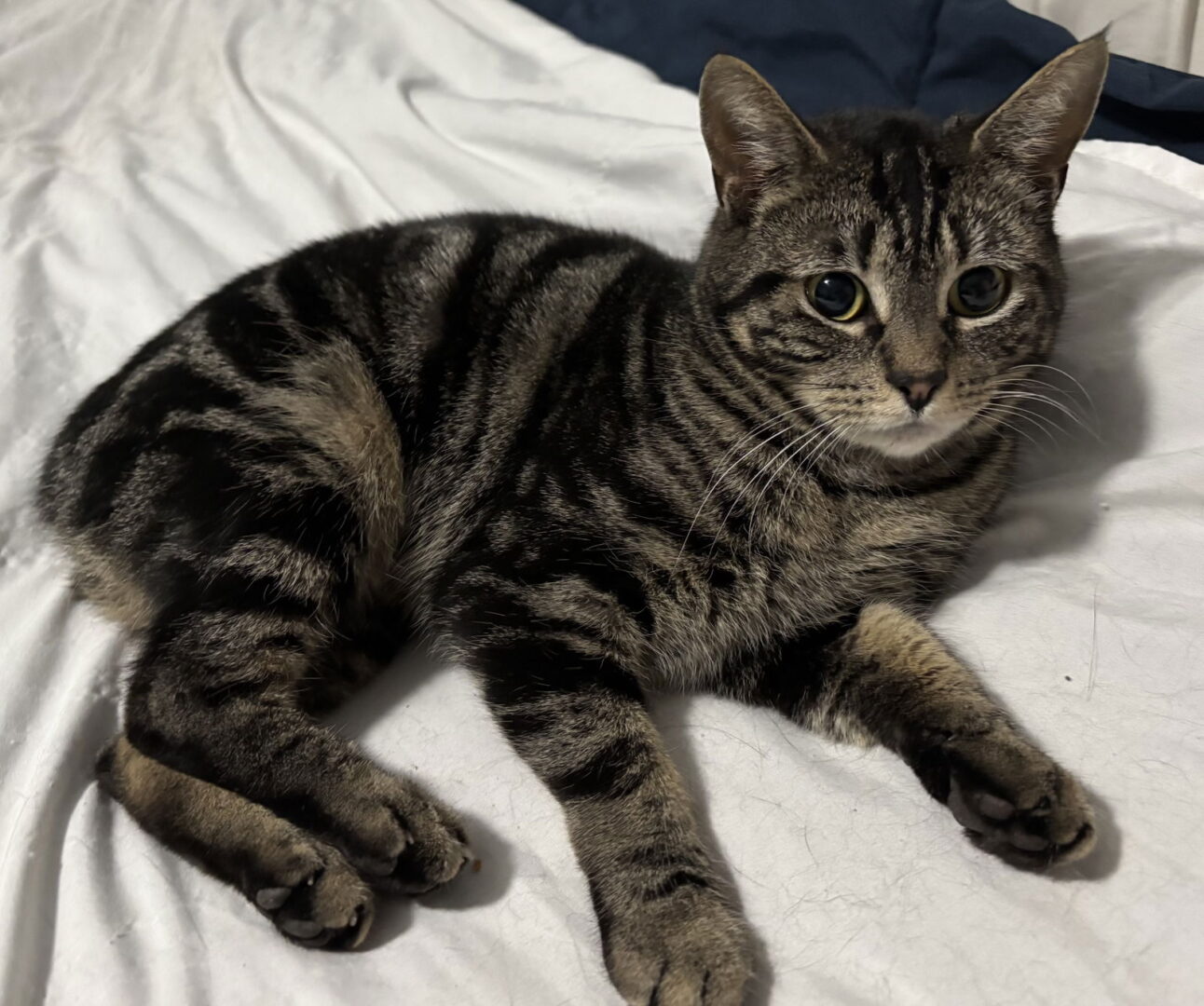 Meet Trish, aka Nubben (she has no tail). Trish and her two kittens, Oscar and Lola, were being cared for outside by a nice lady. Trish is a tiny tabby with beautiful swirly markings. While she is young (approx. 1 to 1.5 years old), she has already had a few litters of kittens. Trish is timid at first, and is very sweet with a little touch of spice. She loves to be pet and will reward you with loud purrs. Once comfortable, she will follow you around, rub on your legs, and look for attention/food/treats. She is very food motivated. Trish is not a fan of being held, but will let you pick her up for short periods of time and will cuddle on your shoulder and purr. She will sleep on your bed with you. She is easy to put into a carrier if needed. She is very independent. Trish does not seem to lfemale cats, but does fine with male cats. She does not interact much with them, so she would be fine as an only cat. Although she has started playing a lot with her daughter Lola. Trish is not a lap cat yet, and still will hide when new people are around. She is super playful; very kitten-like. She gets the zoomies and runs around the house. The perfect home for her would be a quiet one with no young children, no female cats. Trish's adopter should be an experienced cat owner who understands she will need time to adjust. Trish has not been exposed to dogs, so it's not clear how she will do. Trish was born around November 3, 2023, and is currently being fostered in Shelton. She is fixed, up-to-date on shots, microchipped, and tested negative for FIV/FeLV. All of our cats and kittens are cared for in loving foster homes. "Meet and Greets" can be arranged only after an application has been submitted and approved. Applications for adoption can be found at our website at www.fosterandforever.org. Our volunteers do their best to respond within 24-48 hours.