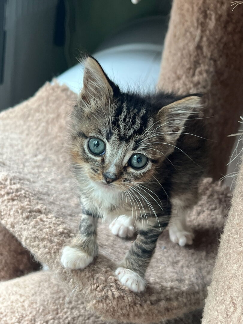 Triumph and his baby siblings came to LCCR in March 2025 when a kind person found them alone without their mom. An LCCR foster bottle fed them and worked hard to make sure they would thrive. Triumph was the smallest of the three, and he had a harder time gaining weight and thriving than his siblings. Both of them got adopted, and Triumph was still small (but charming!). Finally he hit his stride after a cocktail of medicines and now he is a healthy and robust older kitten! He is making up for lost time and living his best live in his foster home with his fellow foster cats and even the resident dog. Triumph loves to run around and play with his foster friends. When he was younger he didn't realize he was much SMALLER than the older kittens and cats that he tried to wrestle with. He chases balls and feather toys and will jump at your feet if nothing else is at the ready. He eats out of a slow feeder bowl because he inhales his food. He can be a little playful with his teeth, so little kids are probably not the best fit for him right now until he learns his manners more and/or grows up more. All that said, Triumph also has a quiet side–he loves to rub against anyone who comes to visit and he is known to pass out on sofas and cat beds. He loves to climb in your lap and rub all over you for attention. He will fall asleep on you too. He'd be a great pet for a family who has little kids who love to play, or a friend for a playful cat (or two!) or a dog. He will be at adoption events through the season if he isn't adopted first! Triumph's adoption donation is $135 and includes age-appropriate vaccines, dewormer, flea treatment, Felv/FIV testing (negative), microchip, and neuter. He is currently living in a foster home in New Cumberland. If you would like more information on Triumph, please contact lovingcarecatrescue@gmail.com. If you would like to fill out an online application, please visit https://lovingcarecatrescue.org/adopt/adoption-application/ Please note: LCCR does not allow our adopted cats and kittens to be declawed. All adopted kitties are to be kept as indoor-only pets.If you are interested in adopting this kitty, please fill out the online application at https://alovingcarecatrescue.org/adoptionapplication.html