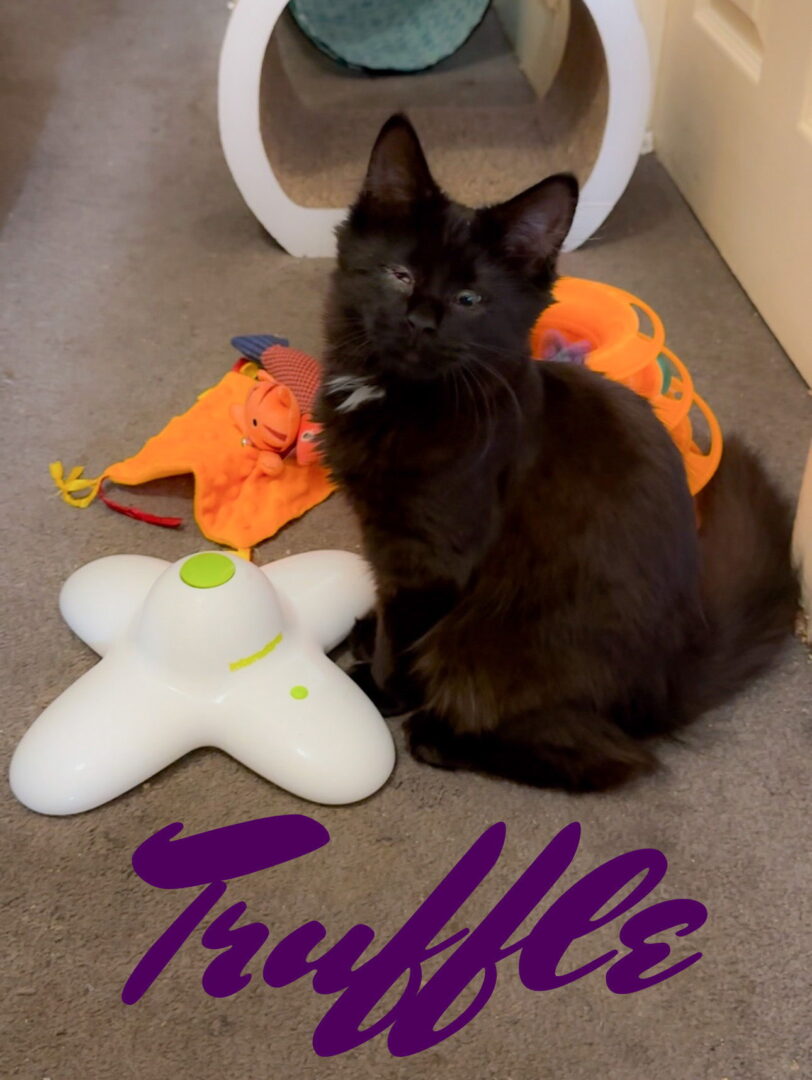 Meet Truffle! This beautiful 4 month-old long-haired female black kitten was born with a congenital condition called microphthalmia, in which the eyeballs are much smaller than normal. But that doesn’t stop Truffle from doing everything other cats can do. She is a happy kitten and doesn’t require any special medical care. Despite having smaller eyes, she is just as playful and rambunctious as any other kitten. She loves running in and out of her cat tunnel, batting around her toy springs, and wrestling with her sister and best friend, Cocoa Bean. Truffle is happy and healthy, and her condition only adds to her cuteness. She loves attention and is a docile and affectionate little girl. Truffle would love to be adopted with her sister, Cocoa Bean, but if that is not possible, she would do best in a home with another friendly and playful cat. She has also acclimated well with her foster mom’s dog and would do well with older children. Truffle is playing with her foster family. Submit a no-obligation application for a meet and greet or to adopt today: https://forgottencats.org/adoption-application/ (Foster: Liza W.).
