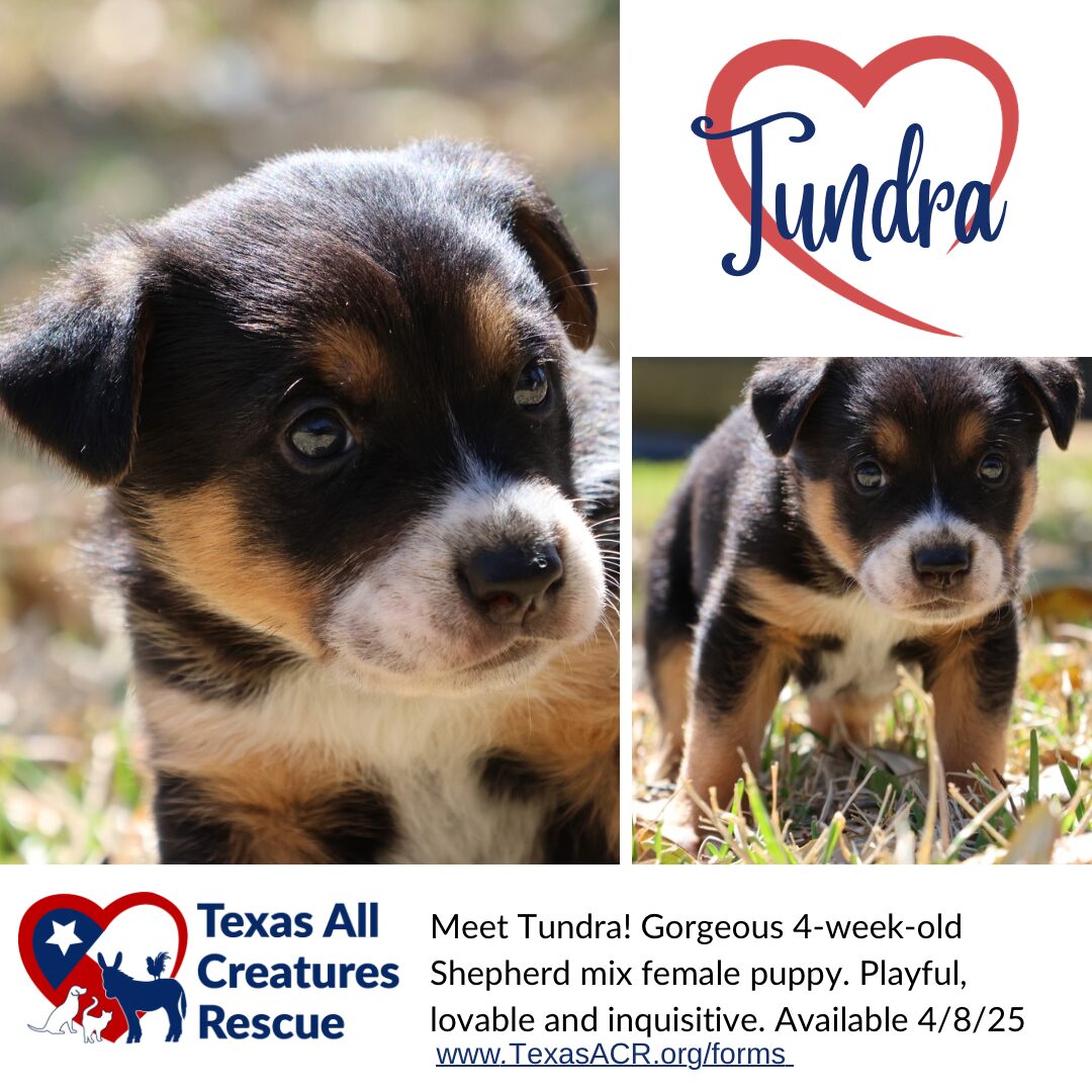 See Tundra’s HomepageGo to our official website Ready for Pre-Adoption! Meet Tundra – a 4-week-old cutie with a heart full of love! This purple-collar girl is a bit shy , but her affectionate nature shines through when she’s with her people. Petite yet mighty , Tundra loves to play with her Lamb Chop toy , and her sweet personality is sure to win you over. If you’re looking for a loving, gentle companion who’s also full of spunk, Tundra might be the perfect match for you! She will be ready to join her new family on April 8, 2025 . Apply today and make Tundra part of your family! TexasACR.org We are a non-profit 501c3 Animal Rescue located in Dallas/Fort Worth, Texas. Our passion is centered around assisting animals that have been abandoned, neglected, or abused. We are a foster-based rescue consisting of 100% volunteers. If you are interested in becoming a foster, please email info@TexasACR.org