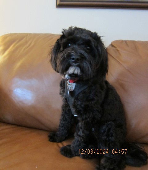 Twilight aka Twyla breed – poodle mix black with some white markings / poodle coat female spayed 1 yr old vac utd microchipped active / athletic not aggressive or reactive with food or toys very sweet, wants to cuddle once she gets to know/trust you/family seems ok with strangers but might bark. she can still be a bit timid when startled but not aggressive loves other dogs Love to play, loves her toys…will sometimes chew on inappropriate things (blankets, slippers) so needs supervision. She will chew/eat stuffies so should only have access to such toys under supervision. She is rapidly responding with training to know what she can or cannot play with. She is crate trained. At feeding time she runs to her crate and waits to be fed. She no longer needs to be crated thru the night Almost housetrained but could still have accidents Is still crated when no one will be home….she will sometimes cry. travels well in the car does bark … as she learns to trust the barking is becoming less … she will respond to a gentle command to quiet she is quickly learning sit, down commands …such a smart girl! Because of her puppy mill past, starting over in a new home/new family she will need time/patience/space to adapt to all the change. She will most likely express her uncertainty with a few growls Now that she trust me I am able to handle her with no concerns. Picking her up or cleaning snow off her legs/feet are are now done without issue … she has gotten over any fear she had associated with handling (when she first came in she was a matted mess and needed grooming; she did snap and nip our groomer) She was a good girl at the vets. Does stairs like a pro. Walking on a leash with no problem other then she does tend to pull. ( Caution when out walking / she could be still a flight risk) It's a real joy to watch her run free with the speed of a greyhound, doing her zoomies around the yard. She loves the snow.