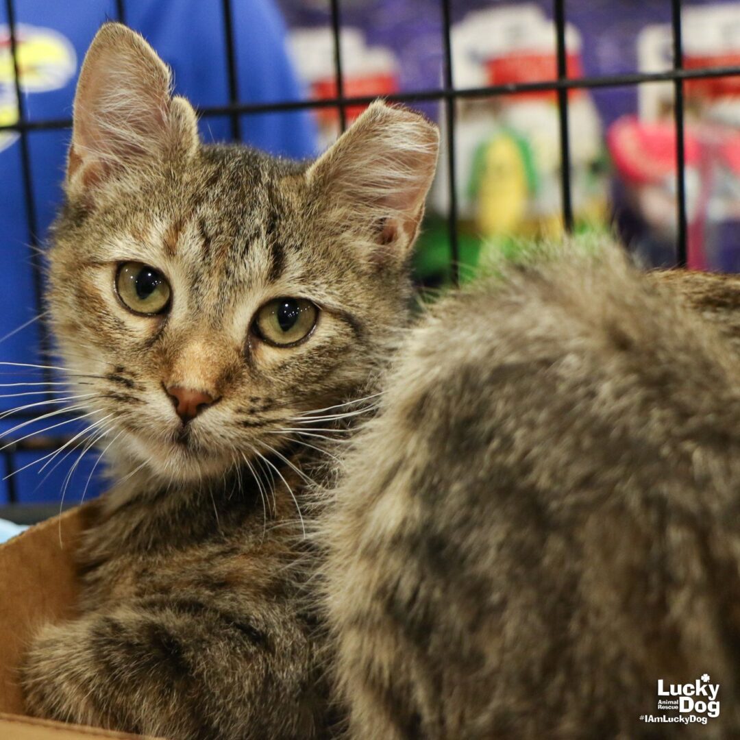 Please contact Mollie Gorney (mollieg@luckydoganimalrescue.org) for more information about this pet.Gorgeous girl wants to be the Twinkle in your eye!TWINKLES NEEDS A FOREVER HOME! Name: Twinkles Best Guess for Breed: Domestic Short Hair Age: 3.5 months as of 1/10/25 (Est. DOB 9/29/24) SEX: Female Approximate Weight: 4 lbs as of 12/15/24 Coloring: Brown Tabby Type of Hair: Short Gets Along With: With proper integration, Twinkles will likely get along with other cats, dogs and kids with an acclimation period. She is currently living with a dog and slowly warming up. We’re happy to help with tips and tricks! Currently Living at: DC area foster home I am Looking For: My loving forever family! Hi! I’m Twinkles, and I am a cute little kitty! I won’t ask for much- just some love, cuddles and lots of toys so I can run and play and be my kitty self. What My Foster Says About Me: Twinkles is an amazing little girl. She’s incredibly cuddly and will climb up on my shoulder for a nap. She also likes to snooze in my lap when she is done playing. She also purrs anytime I’m around and follows me everywhere I go. When she isn’t sleeping, she’s running around, chasing her toys, exploring, and looking out the window. She’s happy playing on her own or with me. She is curious about my dog, and will hiss occasionally and keep her distance. They have only interacted through a doggy gate so far, but I am sure with time, she will be able to live with a pup. Don’t miss out on this gem of a kitten! Kitten Vetting Requirements: Your kitten may not be fully vaccinated upon adoption. You will be responsible for providing whatever remaining vaccines are needed to complete the kitten vaccine series. TO ADOPT: The adoption fee for adult cats is $200 ($350 for two cats adopted together). The adoption fee for a kitten (under 7 months old) is $220 ($380 for two kittens adopted together).If you are interested in adopting, please complete the Adoption Questionnaire online at bit.ly/adoptaluckycat. Lucky Dog Animal Rescue does our best to provide accurate information about the cats we have for adoption. That said, we cannot make any guarantees about age, breed or temperament. Thank you for contacting Lucky Dog Animal Rescue and helping to save a life! Please visit us online at www.luckydoganimalrescue.org . BE A FOSTER!!! Fosters make it possible for Lucky Dog Animal Rescue to save and care for homeless and abandoned dogs! To learn about fostering, please contact fostering@luckydoganimalrescue.org BE A SPONSOR!!!! Sponsors help Lucky Dog support the many dogs we save. To learn more about sponsorship, please contact info@luckydoganimalrescue.org !