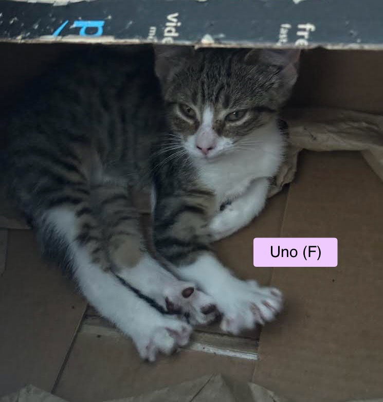 See Uno’s HomepageGo to our official websiteAdoption Fees $200 for kittens up to one year $160 for cats over one year All cats have been: – Spayed/neutered – FVRCP vaccinated – FeLV tested (FeLV/FIV for adults) – Dewormed – Flea treated – Microchipped Uno: Meet Uno (short for Uno Dos Tres ) , the adorable female kitten named for the striking white patch on her back and two black freckles on her nose ! Don’t be fooled by her terminal angry face glare—she’s actually a sweetheart who adores head scratches and cuddles. Uno’s favorite pastime is napping in cozy boxes, where she feels safe and snug. During playtime, she’s known to go on the attack, showing off her playful spirit, before retreating to hide from her littermates. She’s also a connoisseur of comfort, often found lounging on the rocker or gracing her humans with the honor of a nap on their lap—a cherished cuddle indeed. If you’re looking for a kitten with personality plus a penchant for both play and relaxation, Uno is ready to charm her way into your heart! Uno: Meet Uno (short for Uno Dos Tres ) , the adorable female kitten named for the striking white patch on her back and two black freckles on her nose ! Don’t be fooled by her terminal angry face glare—she’s actually a sweetheart who adores head scratches and cuddles. Uno’s favorite pastime is napping in cozy boxes, where she feels safe and snug. During playtime, she’s known to go on the attack, showing off her playful spirit, before retreating to hide from her littermates. She’s also a connoisseur of comfort, often found lounging on the rocker or gracing her humans with the honor of a nap on their lap—a cherished cuddle indeed. If you’re looking for a kitten with personality plus a penchant for both play and relaxation, Uno is ready to charm her way into your heart! Uno: Meet Uno (short for Uno Dos Tres ) , the adorable female kitten named for the striking white patch on her back and two black freckles on her nose ! Don’t be fooled by her terminal angry face glare—she’s actually a sweetheart who adores head scratches and cuddles. Uno’s favorite pastime is napping in cozy boxes, where she feels safe and snug. During playtime, she’s known to go on the attack, showing off her playful spirit, before retreating to hide from her littermates. She’s also a connoisseur of comfort, often found lounging on the rocker or gracing her humans with the honor of a nap on their lap—a cherished cuddle indeed. If you’re looking for a kitten with personality plus a penchant for both play and relaxation, Uno is ready to charm her way into your heart! Uno: Meet Uno (short for Uno Dos Tres ) , the adorable female kitten named for the striking white patch on her back and two black freckles on her nose ! Don’t be fooled by her terminal angry face glare—she’s actually a sweetheart who adores head scratches and cuddles. Uno’s favorite pastime is napping in cozy boxes, where she feels safe and snug. During playtime, she’s known to go on the attack, showing off her playful spirit, before retreating to hide from her littermates. She’s also a connoisseur of comfort, often found lounging on the rocker or gracing her humans with the honor of a nap on their lap—a cherished cuddle indeed. If you’re looking for a kitten with personality plus a penchant for both play and relaxation, Uno is ready to charm her way into your heart! Adoptions Events on Saturdays: Petco in Vacaville, 210 Nut Tree Pkwy from 11am-2pm Petco in Fairfield, 1320 Gateway Blvd, from 2- 5pm Petco in Novato, 208 Vintage Way, from 12-3pm Because all of our cats are in foster homes, not all cats come to adoptions every weekend. If you are interested in a specific kitty, please contact us to make sure he/she will available for you to meet at catinfo@catalesrescue.org If you can't wait until then to meet any cat or kitten, contact catinfo@catalesrescue.org. Like us on FaceBook by going to:http://www.facebook.com/EveryLifeisaStory