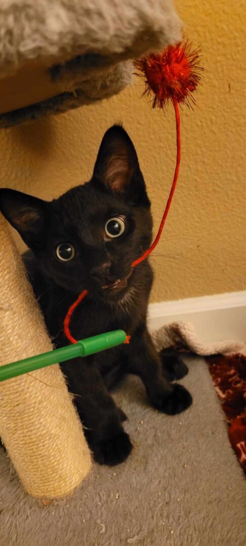 I am currently available for adoption at the Rancho Santa Margarita Petsmart. If you’re interested in adopting me, fill out an application on our website www.carmaoc.org Hi! My name is Valdosta and I’m a loving little panther. I was born in a foster home and had a wonderful momma cat that cared and doted on me and my 4 siblings. Now I’m ready for my forever home. Being a kitten I have lots of energy and love to run, jump, climb and wrestle with my siblings. I love running after the cat wand toy, batting balls around the room and carrying toys in my mouth. I would love to be adopted with one of my siblings or have a kitty friend in my new home. I am good being held after a good play session and love to snuggle on your lap for a nap after. I met a dog in my foster home and while I was nervous did well with her. My adoption fee is $175. That includes spay/neuter, microchip, FIV/FeLV combo test, current vaccines and health check.