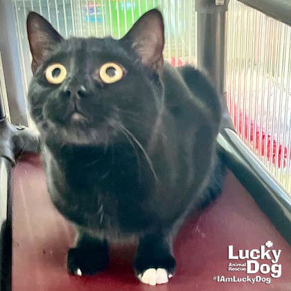 Please contact Lauren McCarty (laurenmc@luckydoganimalrescue.org) for more information about this pet.Mini panther looking for his forever family!VANCE NEEDS A FOREVER HOME! Name: Vance Best Guess for Breed: Domestic Short Hair Age: 4 years DOB: 10/29/20 SEX: Male Approximate Weight: 10lbs Coloring: Black Type of Hair: Short Gets Along With: With proper integration, Vance will likely get along with other cats, dogs and kids with an acclimation period. We’re happy to help with tips and tricks! Currently Living at: Check out our Lucky Cats on Instagram at the Meo Maison Cat Cafe Méo Maison Cat Cafe (1336 Wisconsin Ave NW, Washington, DC 20007). You can come visit me at Méo Maison Cat Cafe during the cafe’s operating hours! If you would like to visit the cafe, please make an appointment on their website (meomaison.com). If you want to adopt me, you will need to complete the adoption process through Lucky Dog Animal Rescue. I am Looking For: My loving forever family! Hi! I’m Vance, and I am a cute little kitty! I won’t ask for much- just some love, cuddles and lots of toys so I can run and play and be my kitty self. What the Shelter Says About Me: Inky black, golden eyes and 2 or 3 white toes like he was checking to see if the paint was dry…that’s Vance. He is a good friend to other cats and a good companion to visitors and volunteers. Vance lives with a group of other adult cats in a playroom where it would be easy to blend into the shadows since he is a beautiful black kitty, but the wee bit of white on his left front paws makes him easy to find and ID. This sweet boy was abandoned in a box with other adult cats but Vace calls himself a ‘special delivery’ – because he gets to start a new life! TO ADOPT: The adoption fee for adult cats is $200 ($350 for two cats adopted together). The adoption fee for a kitten (under 7 months old) is $220 ($380 for two kittens adopted together).If you are interested in adopting, please complete the Adoption Questionnaire online at bit.ly/adoptaluckycat. Lucky Dog Animal Rescue does our best to provide accurate information about the cats we have for adoption. That said, we cannot make any guarantees about age, breed or temperament. Thank you for contacting Lucky Dog Animal Rescue and helping to save a life! Please visit us online at www.luckydoganimalrescue.org . BE A FOSTER!!! Fosters make it possible for Lucky Dog Animal Rescue to save and care for homeless and abandoned dogs! To learn about fostering, please contact fostering@luckydoganimalrescue.org BE A SPONSOR!!!! Sponsors help Lucky Dog support the many dogs we save. To learn more about sponsorship, please contact info@luckydoganimalrescue.org !