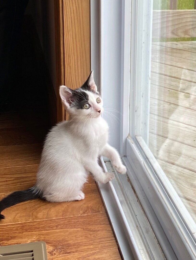 Vega is a very cute mostly white kitten (around 9 weeks old) with three black spots on her head and a black tail. Vega loves exploring and running around with her siblings (Cosmo, Lyra, and Nova who are looking for their forever homes as is her mother Celeste). Vega is very playful – she loves an automatic wand toy and also chasing springs around the room. Though she loves playing, she can also be chill and enjoys hanging out on the couch with her human companions. She is friendly and affectionate. Vega would do well with other cats and her interactions with dogs have been neutral. Nova, Lyra and Vega are playing with their foster family. Momma Celeste and brother Cosmo are playing in our Jenkintown PetSmart adoption center. Please submit a no-obligation application for a meet and greet or to adopt today: https://forgottencats.org/adoption-application/ . Thank you! (Foster: Ellen U.).