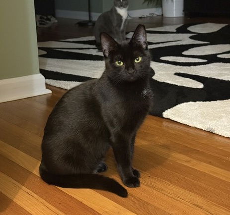 Meet Venus! This little girl is just under a year old and stuns in an all black outfit with tiny patches of white. She was found alongside her sister Serena (see separate bio- FCID 08/03/2025-141). Venus loves to play with wand toys, get booty scratches, and explore around the house! She can often be found sitting on a windowsill to bird watch, too. Venus and her sister are both litter box trained and good at eating/ drinking water. She is reserved at first, but with a little bit of patience this girl truly shines! She is more active than her sister but still only moderately energetic. She doesn’t forget to nap! She will always greet you at the door for breakfast and dinner and loves some good headbutts before chowing down. When she gets excited, she lets out little happy chirps. Venus would do best in a home that is quieter, free from young children or dogs. She has so much potential and I think would make an amazing, affectionate pet just with a little time and patience. Venus is healthy, FIV/FeLV negative, spayed and up to date on all of her vaccinations/dewormers. She would love to find a home alongside her bonded sister Serena, but I think she would be just fine on her own as well. I think she would even be okay with other cats – since she has had positive interactions with them (other than her sister). Please contact her foster parent (Nicole) for any questions or more pictures! Venus and Serena were playing with their foster family. They are new arrivals (11/08/2025) to our Jenkintown PetSmart adoption center. Please offer them your gentle hand to introduce yourself. Please submit a no-obligation application for a meet and greet to adopt: https://forgottencats.org/adoption-application/. Thank you! (Foster: Nicole R.).