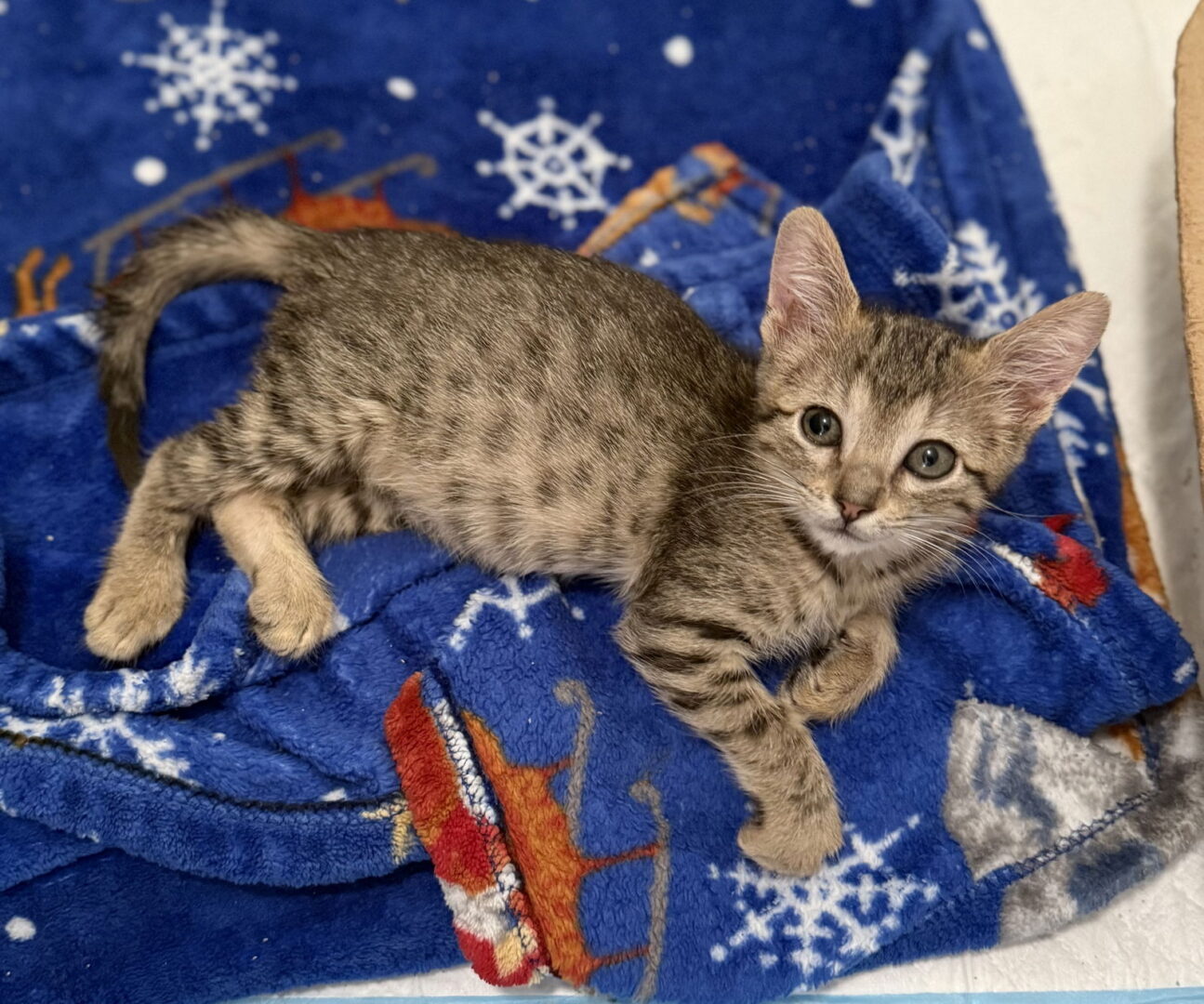 Hi there, I’m Vesper! I am a two month old brown tabby kitten, and I am looking for my forever home! I would be a great kitten for a first time cat owner, because I am sweet, playful, and super cute! Plus, I have a very prominent purr–the minute I get picked up, I purr like crazy! When my foster grandma and grandpa come to see me, I run to them and demand to be picked up! I love to play with my brother Rune; one of our favorite things is to run around with our coil toys. Sometimes, we like to wrestle with each other, and when we are all done, we will sit on our foster mom’s lap and soak up attention! I am litter box trained, and I eat dry and wet food. And as a bonus, I am pretty quiet! My adoption fee is $125, and that includes my vaccines, microchipping, and spay procedure. If I am adopted with my brother Rune, our adoption fee would be $200. I am still too little to have had my spay procedure yet, but if I am adopted before my appointment, my new family can bring me to my spay appointment at the end of October, and SOCA will pay the vet fees. My foster mom will bring me to adoption events at the PetSmart in Fulshear on Saturdays from noon to 3 PM. I would love it if you came to visit me at the adoption event!