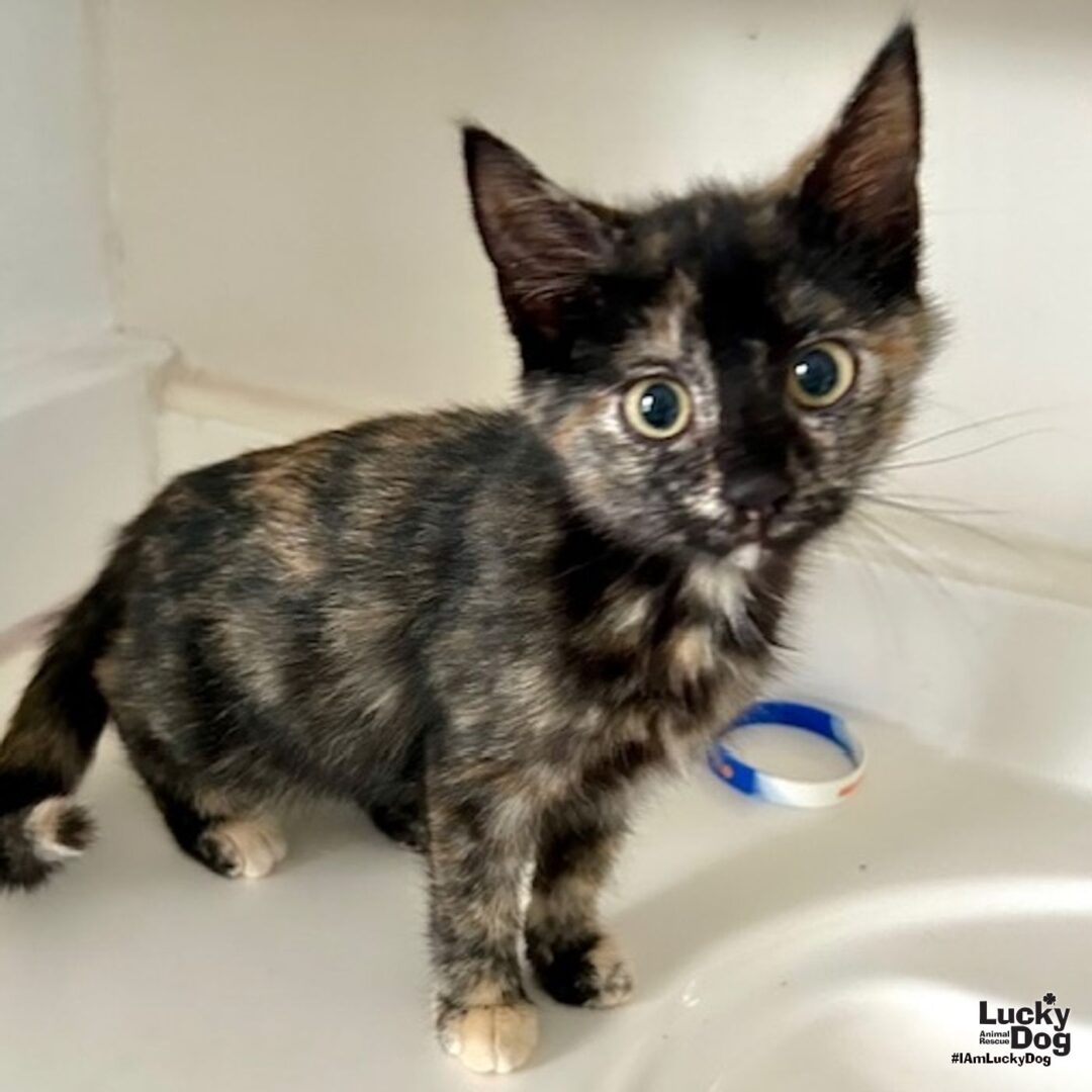 Please contact Lauren McCarty (laurenmc@luckydoganimalrescue.org) for more information about this pet.Sweet kitten needs a forever home!VICTORIA’S SECRET NEEDS A FOREVER HOME! Name: Victoria’s Secret Best Guess for Breed: Domestic Short Hair Age: 11 weeks on 12/13/25 Est. DOB: 9/23/25 SEX: Female Weight: 2.62 lbs as of 12/8/25 Coloring: Tortie Type of Hair: Short Gets Along With: Because of her young age, Victoria’s Secret will likely get along with other cats, dogs and kids with an acclimation period. We’re happy to help with tips and tricks! Currently Living at: Shelter – coming to the DC area soon! I am Looking For: My loving forever family! Hi! I’m Victoria’s Secret, and I am a cute little kitten! I won’t ask for much- just some love, cuddles and lots of toys so I can run and play and be my kitten self. Two kittens are better than one – consider adopting one of my super cute siblings too! Lives With: Victoria’s Secret, Vinny What the Shelter Says About Me: Here comes Victoria – down the cat-walk! She is much the same as her best foster home friend Vinny – a real little cuddle bug. They get some romping time together since they are the same age (but unrelated). Both kittens are quite energetic and get to play in a bathroom together so they can zoom around and still be safe. (Victoria was discarded in a plastic trash bag underneath some other rubbish. A Good Samaritan saw the movement and heard her.) At her foster home, Victoria dips her paw in the water bowl and cleans her face, which is quite sweet! It’s as if she is washing away her past and looking forward! What my Foster Says About Me: Coming soon! Kitten Vetting Requirements: Your kitten may not be fully vaccinated upon adoption. You will be responsible for providing whatever remaining vaccines are needed to complete the kitten vaccine series. Due to this kitten’s young age, she/he has not yet been spayed or neutered. As part of the adoption contract, it will be your responsibility, as the adopter, to ensure that this is done no later than 3/23/26. There are NO EXCEPTIONS and NO EXTENSIONS to this date. A non-refundable spay/neuter deposit will be collected if you would like Lucky Dog to pay for this animal to be spayed/neutered at one of our low-cost partner vets. TO ADOPT: The adoption fee for adult cats is $200 ($350 for two cats adopted together). The adoption fee for a kitten (under 7 months old) is $220 ($380 for two kittens adopted together).If you are interested in adopting, please complete the Adoption Questionnaire online at bit.ly/adoptaluckycat. Lucky Dog Animal Rescue does our best to provide accurate information about the cats we have for adoption. That said, we cannot make any guarantees about age, breed or temperament. Thank you for contacting Lucky Dog Animal Rescue and helping to save a life! Please visit us online at www.luckydoganimalrescue.org . BE A FOSTER!!! Fosters make it possible for Lucky Dog Animal Rescue to save and care for homeless and abandoned dogs! To learn about fostering, please contact fostering@luckydoganimalrescue.org BE A SPONSOR!!!! Sponsors help Lucky Dog support the many dogs we save. To learn more about sponsorship, please contact info@luckydoganimalrescue.org !