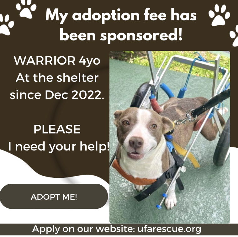 See Warrior’s HomepageGo to our official websiteYou can fill out an adoption application online on our official website. ADOPTION APPLICATION: https://ufarescue.org/adoption-application My adoption fee is sponsored. Warrior was found back in December on the side of a highway, very skinny, and dragging himself to the bushes. Unfortunately this guy had suffered a lot, and it is unknown what have caused the fracture on his back. He was tested positive for heartworm and thankfully we have done the complete treatment already. He is now finally neutered, cured, vaccinated, microchipped and all set to find a wonderful family to make him forget all the nightmare he had to endure in life. Warrior needs someone to teach him love! Someone that walk him at least 2 to 3 times a day on his wheelchair, and he can smell the flowers…He need to find love! Warrior would do better in a home where he is the only child, and only with adults. Since he cannot walk, makes him to be frustrated when there is too much noise, or other animals running around. A chance is all he needs. Shelter has become a sad and depressing place for him to be. ADOPTION APPLICATION: https://ufarescue.org/adoption-application