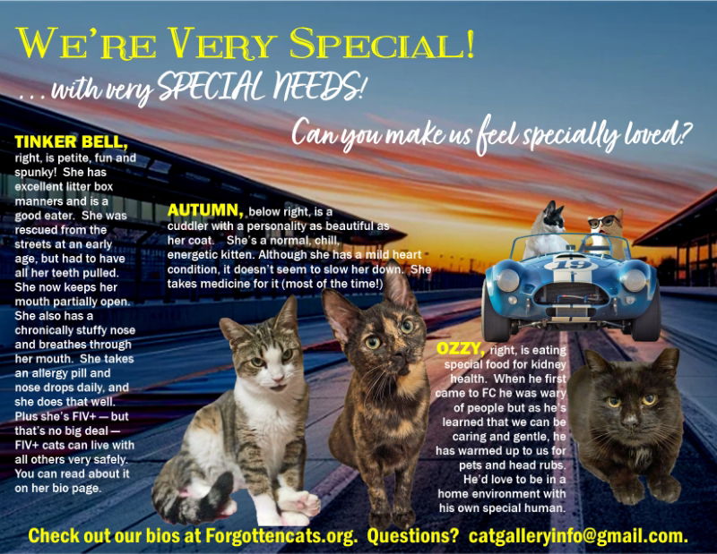 Please consider us!!! These female and male kitties need either special food or have a medical condition that requires medication. They all have love to give and are looking to become your new family member(s). All of the cats featured in our collage have individual posts so you can read their biographies and see more photos and possibly a video. Adopting special needs cats is not just an act of kindness; it’s a transformative journey that enriches both the lives of these remarkable felines and their human companions. Each cat comes with a unique story and personality, often displaying a resilience and joy that can inspire all who meet them. The bond formed through compassion and dedicated care is profound, as you witness their growth and happiness unfold before your eyes. Imagine the joy of seeing a once-timid cat blossom into a confident companion, reminding us that love knows no bounds. By opening your heart and home to a special needs cat, you join a vibrant community of fellow animal lovers committed to making a difference. Together, we can create a world where every cat, regardless of their challenges, has a chance to thrive and share their love. Embrace the rewarding experience of adoption and be a part of something truly special! Please consider taking a chance on one or more of them. Thank you so much. Please submit our no-obligation Adoption Application at: https://forgottencats.org/adoption-application/. Not ready to adopt? Please consider fostering: https://forgottencats.org/foster-a-cat/. Thank you! (Foster: Trainer, Willow Grove, Foster Families)