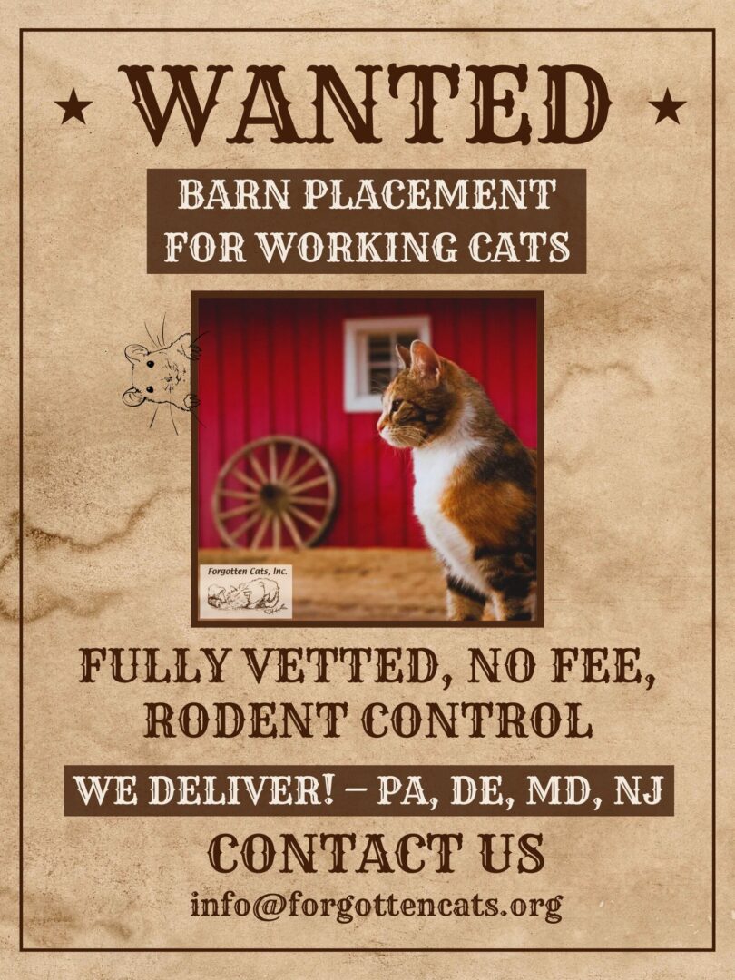 Are you looking for a cat or two or more for you barn? If not, do you know someone who is? Some of the cats we rescue from unsafe conditions are not suited to be indoor house pets but could thrive as barn cats. Some may lack refined socialization skills, but they integrate well into the rest of the farm family. Given food, water, and shelter, these cats could live out their lives and even help control your rodent population. Forgotten Cats’ barn cats may be cats who are social but too feisty interacting with people to be acceptable as indoor family pets. They may be shy or fearful of people and prefer the company of other cats and animals. They may be cats whose litterbox habits make them unsuitable to live indoors (and for whom medical issues have been ruled out). Or they may be truly feral but unable to go back to where they are found due to dangerous or life-threatening living conditions. The barn life is often a perfect middle ground for this special segment of the domestic feline population. Barn cats often make wonderful outdoor family pets for farm families. They can be loving and affectionate on their own terms while “working” in the barn, helping to keep the rodent population in check! At Forgotten Cats, all cats in its barn cat program are fully vetted. They are spayed/neutered and vaccinated and have received whatever medical care they may have needed. Individuals interested in adopting barn cats must be able to provide the cats with warm and safe shelter, a dependable source of food, fresh water and vet care. Barns, stables, and sheds are all considered suitable shelters for these cats. These mousers will provide totally organic rodent control! There is no fee charged to you for a Forgotten Cats barn cat. After chatting with one of our barn cat program volunteers to make sure you are prepared to care for your new cats, Forgotten Cats volunteers will even deliver them to you! Forgotten Cats often has barn cats available for immediate adoption. If not, they will place your name on their barn cat program waiting list. If this sounds like a purrfect option for your barn or stable, contact Forgotten Cats, info@forgottencats.org. Thank you!