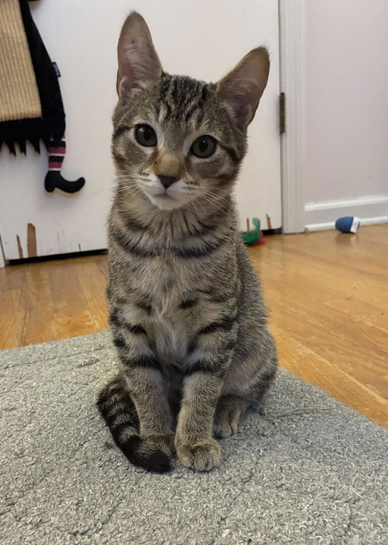 Wilbur (10/22/2025-80) is a three and a half-month old kitten with a special trait. His head tilts to the left as a result of an infection he had as a younger kitten. We aren’t sure whether the head tilt will resolve with time, but it doesn’t stop him from being an active, curious guy! Wilbur is always ready to explore new surroundings and to play. He is especially interested in playing with feather teasers, but any toy will capture his attention. He will take breaks from playing to take brief naps on his foster mom’s lap. Wilbur also has a great time playing with his sisters Charlotte and Fern. Wilbur is great with using the litter box, and he enjoys both wet and dry food – as well as the occasional Churu treat. Please submit our no-obligation Adoption Application for a meet and greet or to adopt: https://forgottencats.org/adoption-application/. Thank you! (Foster: Megan G.)