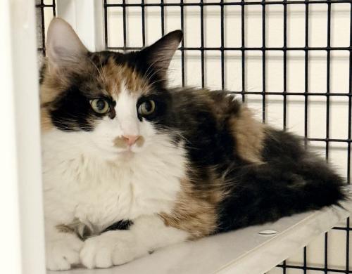 Winnie is one of six beautiful young cats who are all related or close friends. They are 8-10 months old, except for mama Hope who is 2-years-old. We will only adopt these cats out in pairs. These kitties were rescued when they were already half-grown. They are still shy of being petted, although they enjoy human company and playtime. They will need cat-savvy, loving homes where they can continue to deepen their trust in humans. With a little time and patience they will become loving pets in the right hands. Food is the way to their hearts. Winnie is a gorgeous long-haired calico girl who likes to lounge on a cat tree like a princess. Dahlia is an orange/white longhair girl with beautiful amber eyes. She purrs up a storm when her caretakers visit. She wants to be close and will soon dare to be petted. Brie is a sweet little calico girl and the most outgoing of the group. She is very curious, always first at the door when meals are offered or when interesting things are happening. Fig is a very handsome long-haired tuxedo boy. Once he comes out of hiding, he is a goofy, playful chap. Ariel is a very observant, bright little tortoiseshell girl. She likes to lie on a high wall shelf and slow-blink with you from a safe distance. She loves to explore new spaces and find out what’s going on. Hope is the 2-year-old mother and auntie of the younger cats. They all love and respect her. She is the shyest of the group, but there is something very endearing about Hope and her gentle presence. She has gone through very hard times and would love to be in a safe and caring home. You can visit these cats in the ‘Romper Room’ at Kingdom Animal Shelter on Saturdays from noon-3pm. Please note that Kingdom Animal Shelter is not a ‘same day’ adoption shelter. Please visit our website at http://www.kingdomanimalshelter.com/adopt-a-cat.html to learn about our adoption process.