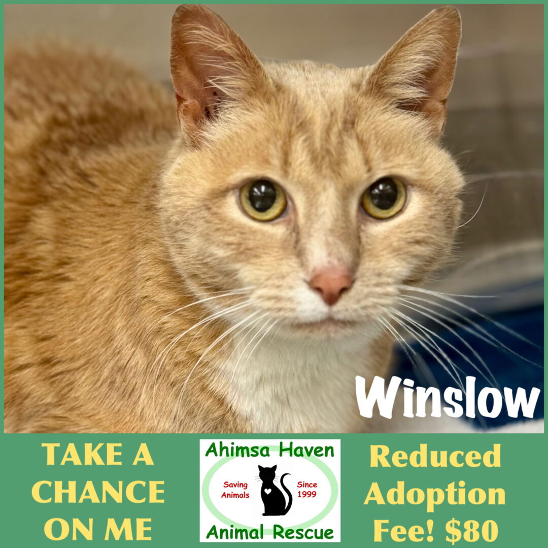 Hello, I’m Winslow, a 12-year-old cat with a gentle soul. I would love my days spent quietly beside a friend. I’m a bit shy at first, but give me a little time, and I’ll show you my sweet and friendly nature. I cherish the moments I get to snuggle up close while you read or watch TV. If you’re looking for a calm companion who loves cozy naps and peaceful evenings, I might just be your perfect match. Let’s make our years ahead warm and full of gentle love. I’m part of the Take A Chance On Me program, which means my adoption fee is lowered to help me find the right match. If you are interested in adopting, applications can be found on our website www.ahimsahaven.org. Meet and greets are with an approved application by appointment only. As always, cats that are ready to be adopted are spayed/neutered, have age appropriate shots, are micro-chipped, dewormed/deflead, and FEL/FIV tested.