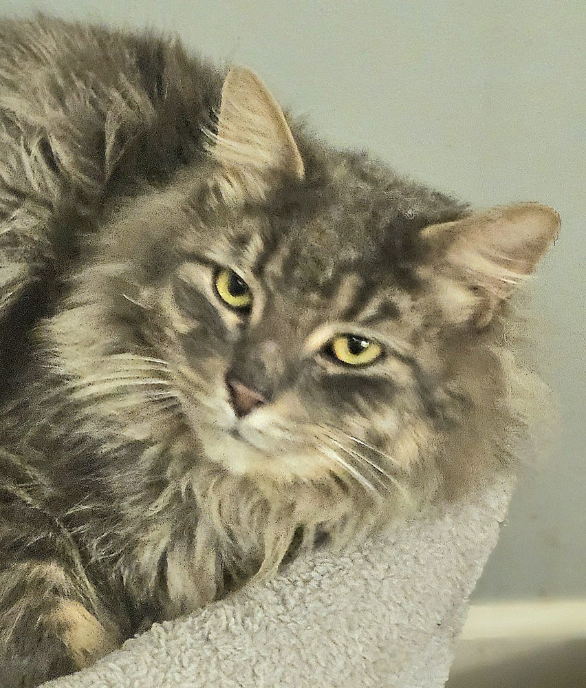 Allow us to introduce the incomparable Winston, a most distinguished gentleman of feline elegance. This splendid 8-month-old, long-haired, grey and brown tabby is endowed with the most striking mane! Winston weighs in at a noble 11 lbs, and possesses a heart as grand as his stature. While initially a touch reserved, Winston quickly proves to be an utter lovebug, eagerly rolling about for pets and purring with such fervor it could rival the finest of engines.His fondness for lap lounging is unparalleled, and he will readily seek out your company, content to bask in affection and shower you with his unrelenting adoration. Winston arrived with his dear sister, Charlotte, after they were trapped outside, yet despite the hardships of their past, he is now ready to embark upon a new chapter in a loving home.Though Winston may require a brief period to relax and acclimate, but once he emerges from his initial shyness, he will be your devoted companion, desiring nothing more than your affection, all day, every day. If you are seeking a magnificent and affectionate feline to grace your home, Winston is most certainly the cat for you.