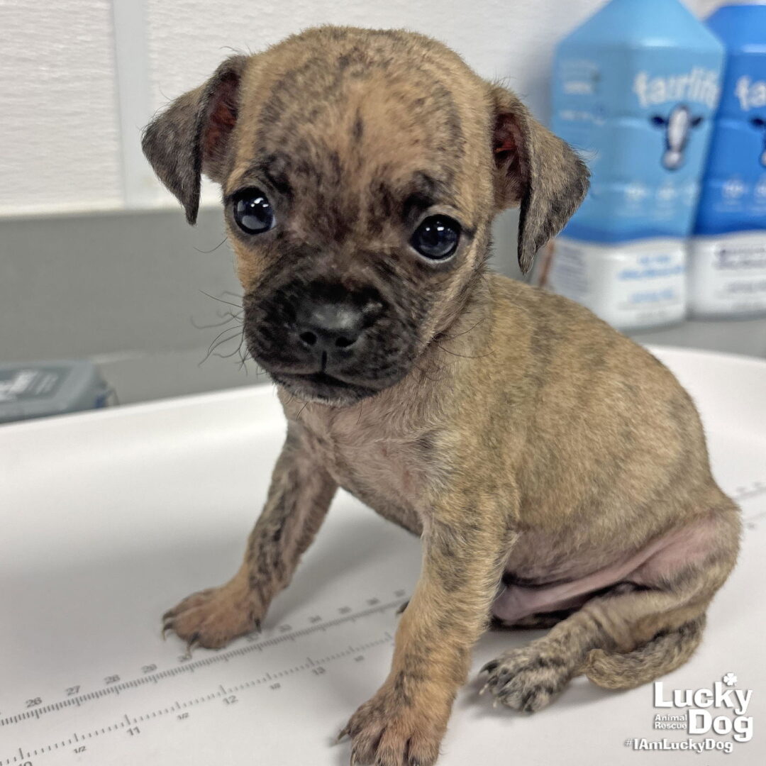 squish baby ISO forever family! WINSTON NEEDS A FOSTER OR FOREVER HOME!!!! Name: Winston Best Guess for Breed: Pug mix (Mama Wanda is def a pug!) Best Guess for Age: 7 weeks as of 10/24/25 (DOB 9/5/25) SEX: Male Estimated Weight (puppies’ weights change quickly!): 1.2 lb as of 10/20/25 Gets Along With: Most puppies are in the prime of their socialization window and will do well with other dogs, cats and kids so long as they receive patience and proper training. Currently Living at: Lucky Dog’s South Carolina rescue campus – needs a foster or forever home in the DC area to get up here Special Adoption Considerations: Puppies under 6 months of age need to have multiple potty breaks/exercise throughout the day. Potential adopters with a standard 8-hour workday must be willing to make arrangements to meet the needs of their puppy. This adorable baby boy is looking for: This cutie is one of four boys (Walter, Winston, Wolfgang, and Wyatt) born to their mama Wanda in a far southern Texas shelter. They all came to the Lucky Dog campus in South Carolina to grow a little bigger and now they are all ready to find their own homes! This is what they’re looking for: Snuggles and cuddles! Play time! World exploration once they’re big enough! Most of all, this baby boy wants to get into a home where he always knows where he belongs, where he is always safe and loved. In exchange, he promises all the love and loyalty in his little body. What do you say? Is he the one for your lap and your life? What My Foster Says About Me: We will update this once he has spent time in foster care. Puppy Vetting Requirements: Lucky Puppies have had their age appropriate vaccines, but may not yet be “fully” vaccinated. It is the adopter’s responsibility to ensure that the remaining puppy vaccines are given at the appropriate time. Please also keep in mind that, until your puppy is fully vaccinated, they are at greater risk for illness than an adult dog. Due to this puppy’s young age, she/he has not yet been spayed or neutered. As part of the adoption contract, it will be your responsibility, as the adopter, to ensure that this is done no later than March 5, 2026. There are NO EXCEPTIONS and NO EXTENSIONS to this date. A non-refundable spay/neuter deposit will be collected if you would like Lucky Dog to pay for this animal to be spayed/neutered at one of our low cost partner vets. Your new puppy will need to work on their house training and will also need to go to obedience school so they can grow into a well-socialized dog! TO ADOPT: The adoption fee for this puppy is $485, which includes the cost of routine vetting and transport from the shelter. If you are interested in adopting, please complete the Adoption Questionnaire online bit.ly/adoptaluckydog Lucky Dog Animal Rescue does our best to provide accurate information about the dogs we have for adoption. That said, we cannot make any guarantees about age, breed or temperament. Thank you for contacting Lucky Dog Animal Rescue and helping to save a life! Please visit us online at www.luckydoganimalrescue.org . BE A FOSTER!!! Fosters make it possible for Lucky Dog Animal Rescue to save and care for homeless and abandoned dogs! To learn about fostering, please contact fostering@luckydoganimalrescue.org! BE A SPONSOR!!!! Sponsors help Lucky Dog support the many dogs we save. To learn more about sponsorship, please contact info@luckydoganimalrescue.org . ​