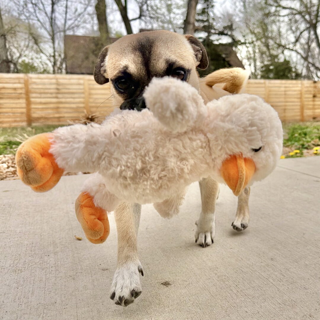 If you’re looking for a truly sweet and spunky sidekick, we’re happy to introduce Winston! This adorable gentleman is estimated to be a 1-year-old “chug” — an irresistibly cute pug and chihuahua blend — weighing in at about 16 pounds. Winston is an active, young little guy, and true to both companion breeds, he is attentive and affectionate and will adore you as much as you adore him. What we love about Winston: – His personality: sweet, sensitive, curious, happy-go-lucky! – He is smart, eager to learn, and always up for a cuddle. – He is a great walker — and those little legs can move fast! – Loves playing with dog friends and his people, and settles nicely for a cozy nap afterward. – Enjoys puzzles, snuffle mats, and will happily self-entertain with his favorite toys (near his people ). – He is a social butterfly and has been a joy to introduce to new experiences, and has been a quick study with positive reinforcement training and structure. – That underbite! That curly pug tail! Consider Winston if you enjoy including your dog in your active daily life: daily walks with time to get good smells, a thoughtful enrichment routine, and quality play and cuddle time. Ideally, Winston would have a well-matched canine sibling that likes to play and would appreciate a bestie. He has been comfortable with dogs large and small, is neutral with cats, and gentle and curious with kids. Because he enjoys lounging outside and attempting to chase birds and bunnies, fencing will be important to keep this little dude safe and allow him to explore. Winston also sleeps through the night, is crate trained, and is solid on his potty routine. Winston could be a great match if you are looking for a charming companion who will make you laugh, keep you on your toes, join you on outings, and happily curl up next to you at the end of the day. He is up to date on age-appropriate vaccines. Please submit an application at eapl.com His adoption fee is $375