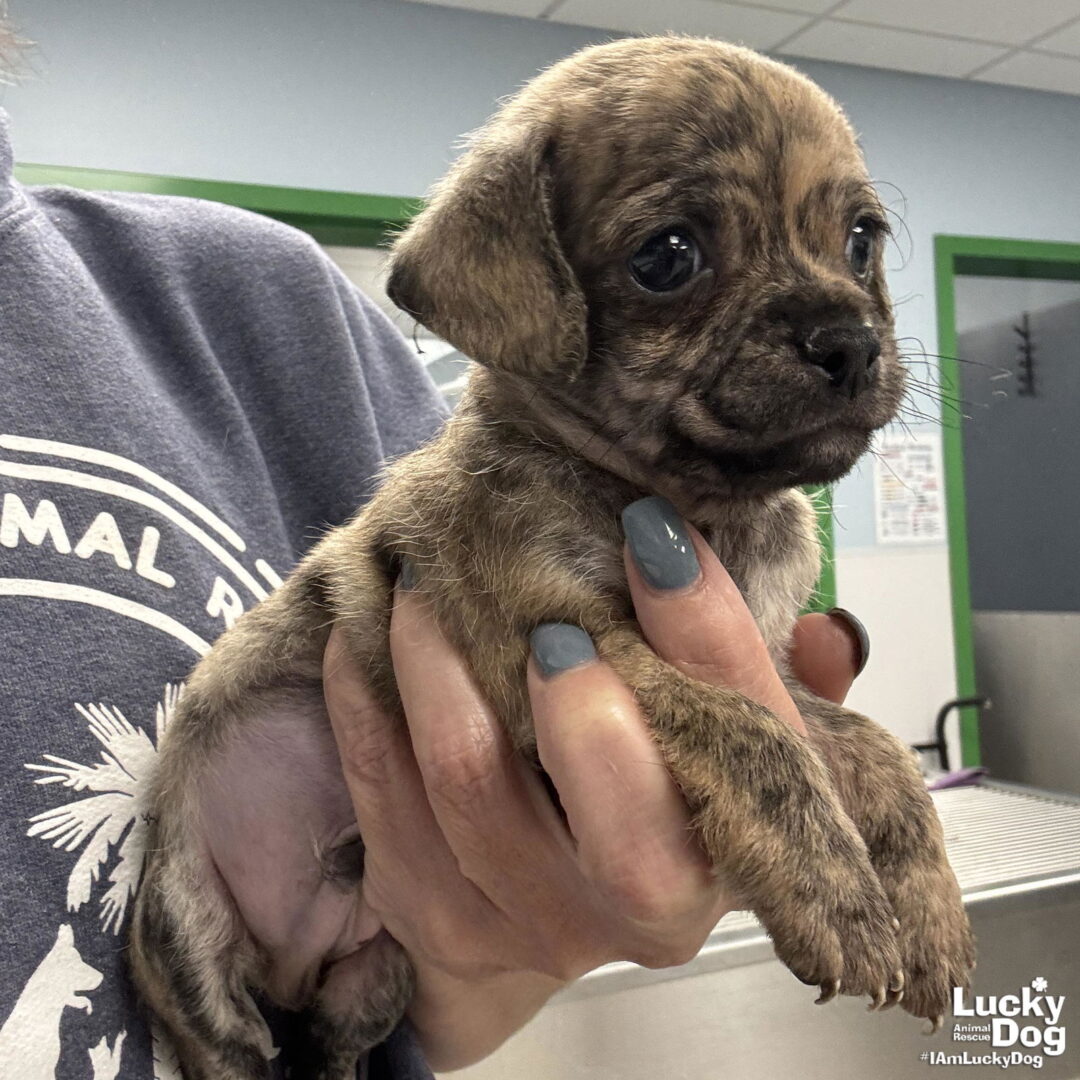 squish baby ISO forever family! WOLFGANG NEEDS A FOSTER OR FOREVER HOME!!!! Name: Wolfgang Best Guess for Breed: Pug mix (Mama Wanda is def a pug!) Best Guess for Age: 7 weeks as of 10/24/25 (DOB 9/5/25) SEX: Male Estimated Weight (puppies’ weights change quickly!): 1.3 lb as of 10/20/25 Gets Along With: Most puppies are in the prime of their socialization window and will do well with other dogs, cats and kids so long as they receive patience and proper training. Currently Living at: Lucky Dog’s South Carolina rescue campus – needs a foster or forever home in the DC area to get up here Special Adoption Considerations: Puppies under 6 months of age need to have multiple potty breaks/exercise throughout the day. Potential adopters with a standard 8-hour workday must be willing to make arrangements to meet the needs of their puppy. This adorable baby boy is looking for: This cutie is one of four boys (Walter, Winston, Wolfgang, and Wyatt) born to their mama Wanda in a far southern Texas shelter. They all came to the Lucky Dog campus in South Carolina to grow a little bigger and now they are all ready to find their own homes! This is what they’re looking for: Snuggles and cuddles! Play time! World exploration once they’re big enough! Most of all, this baby boy wants to get into a home where he always knows where he belongs, where he is always safe and loved. In exchange, he promises all the love and loyalty in his little body. What do you say? Is he the one for your lap and your life? What My Foster Says About Me: We will update this once he has spent time in foster care. Puppy Vetting Requirements: Lucky Puppies have had their age appropriate vaccines, but may not yet be “fully” vaccinated. It is the adopter’s responsibility to ensure that the remaining puppy vaccines are given at the appropriate time. Please also keep in mind that, until your puppy is fully vaccinated, they are at greater risk for illness than an adult dog. Due to this puppy’s young age, she/he has not yet been spayed or neutered. As part of the adoption contract, it will be your responsibility, as the adopter, to ensure that this is done no later than March 5, 2026. There are NO EXCEPTIONS and NO EXTENSIONS to this date. A non-refundable spay/neuter deposit will be collected if you would like Lucky Dog to pay for this animal to be spayed/neutered at one of our low cost partner vets. Your new puppy will need to work on their house training and will also need to go to obedience school so they can grow into a well-socialized dog! TO ADOPT: The adoption fee for this puppy is $485, which includes the cost of routine vetting and transport from the shelter. If you are interested in adopting, please complete the Adoption Questionnaire online bit.ly/adoptaluckydog Lucky Dog Animal Rescue does our best to provide accurate information about the dogs we have for adoption. That said, we cannot make any guarantees about age, breed or temperament. Thank you for contacting Lucky Dog Animal Rescue and helping to save a life! Please visit us online at www.luckydoganimalrescue.org . BE A FOSTER!!! Fosters make it possible for Lucky Dog Animal Rescue to save and care for homeless and abandoned dogs! To learn about fostering, please contact fostering@luckydoganimalrescue.org! BE A SPONSOR!!!! Sponsors help Lucky Dog support the many dogs we save. To learn more about sponsorship, please contact info@luckydoganimalrescue.org . ​