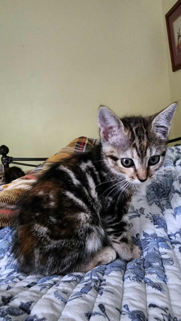 Hola, I’m Zambomba — yes, it’s a big name for a small kitten, but I’ve got the energy to back it up! I’m a sweet, mischievous little shadow who loves laps, climbing, and surprise pounces (the sneakier, the better). My motto: “If it moves, I chase it. If it doesn’t, I climb it.” When I’m not performing daring acrobatics, you’ll find me snuggled up purring like a tiny motor. Adopt me if you dare — I promise equal parts cuddles and chaos, with a whole lot of love in between. Zambomba =^..^=, DSH Patch Target Tabby, Female, DOB 8/3/2025 https://cataroundtownproject.org/adoption-application/
