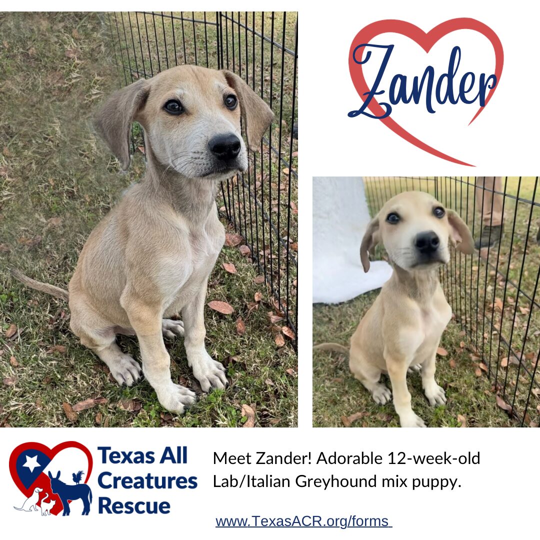 See Zander’s HomepageGo to our official websiteMeet Zander! A resilient and handsome pup who’s ready for his brand-new beginning! Born on 9/3/25 , Zander and his siblings were discovered living beneath an abandoned home after their roaming family was featured in the Godley, Texas news. Thankfully, Texas All Creatures Rescue stepped in just in time! Now safe in a loving foster home, Zander is blossoming into a fun-loving boy with the cutest puppy personality. He appears to be a Lab/Italian Greyhound mix , giving him just the right blend of playful energy and sweet snuggles. He’s curious, smart, and loves to be near his people. Zander is vaccinated, microchipped, and ready to join his forever family today ! If you’re looking for a loyal companion who will grow up knowing just how loved he is, Zander is your guy. Apply to adopt at: TexasACR.org We are a non-profit 501c3 Animal Rescue located in Dallas/Fort Worth, Texas. Our passion is centered around assisting animals that have been abandoned, neglected, or abused. We are a foster-based rescue consisting of 100% volunteers. If you are interested in becoming a foster, please email info@TexasACR.org