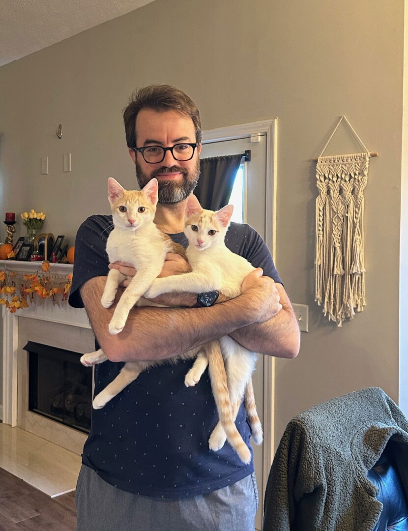 See Zeg’s HomepageGo to our official websiteYou can fill out an adoption application online on our official website.Estimated Date of Birth: 7/3/2025 Meet Zeg & Darington — the Ultimate Cuddle Duo! Zeg and Darington are absolute characters and complete heart-stealers. These two are not shy about asking for affection—in fact, they’ll stand on their hind legs, wave their front paws, and meow loudly until you pick them up. We call it “asking for uppies,” and it’s impossible to resist. Honestly, if an infant carrier for cats existed, we’d be using it daily. Zeg lives for action and being part of the fun, especially when it involves our toddler. He’s a huge fan of story time, playing with toy cars, and is surprisingly helpful when it’s time to wake our son from naps. Kisses, cuddles, being carried around—Zeg is all in and loves feeling included in everything. Darington enjoys playtime too, but his true passion is cuddle time. He patiently waits for someone to sit down so he can hop up and soak up the love—and if that moment doesn’t come quickly enough, he’ll let you know he’s ready for snuggles. Both boys are delightfully quirky. They love riding around on shoulders, falling asleep on your head, making expert-level biscuits, and purring as loudly as possible. They’re also fascinated by water—chasing toys in the bathtub is a favorite activity, and Zeg especially enjoys fishing ice cubes out of a bowl. When they’re not busy being with their humans, you’ll find them snuggled together on a cozy throw blanket. Zeg and Darington are funny, cuddly, mischievous, deeply affectionate, and truly special. They are the kind of cats you fall completely in love with. Our family adores them, and if we could adopt them ourselves, we absolutely would. We’re hopeful that a wonderful person or family will see these two and realize they’re the missing piece their home has been waiting for. Zeg and Darington are a bonded pair and must be adopted together. Shout out to @brownbunnyphoto for the photos with the white background! Siblings: Darington Adoption Fee for two kitties: $225 Zeg is neutered, microchipped, tested negative for FIV and Feline Leukemia and is up to date on vaccines.